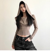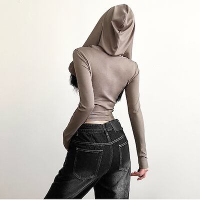 2024 春秋 フード付き tシャツ ファッション トップス 薄手 韓国系コーデ 重ね着風 長袖 切替 ソリッドカラー衣装シャツスリムトップパイル襟シャツ肌見せ女っぽフレンチタイト丈 レディース T