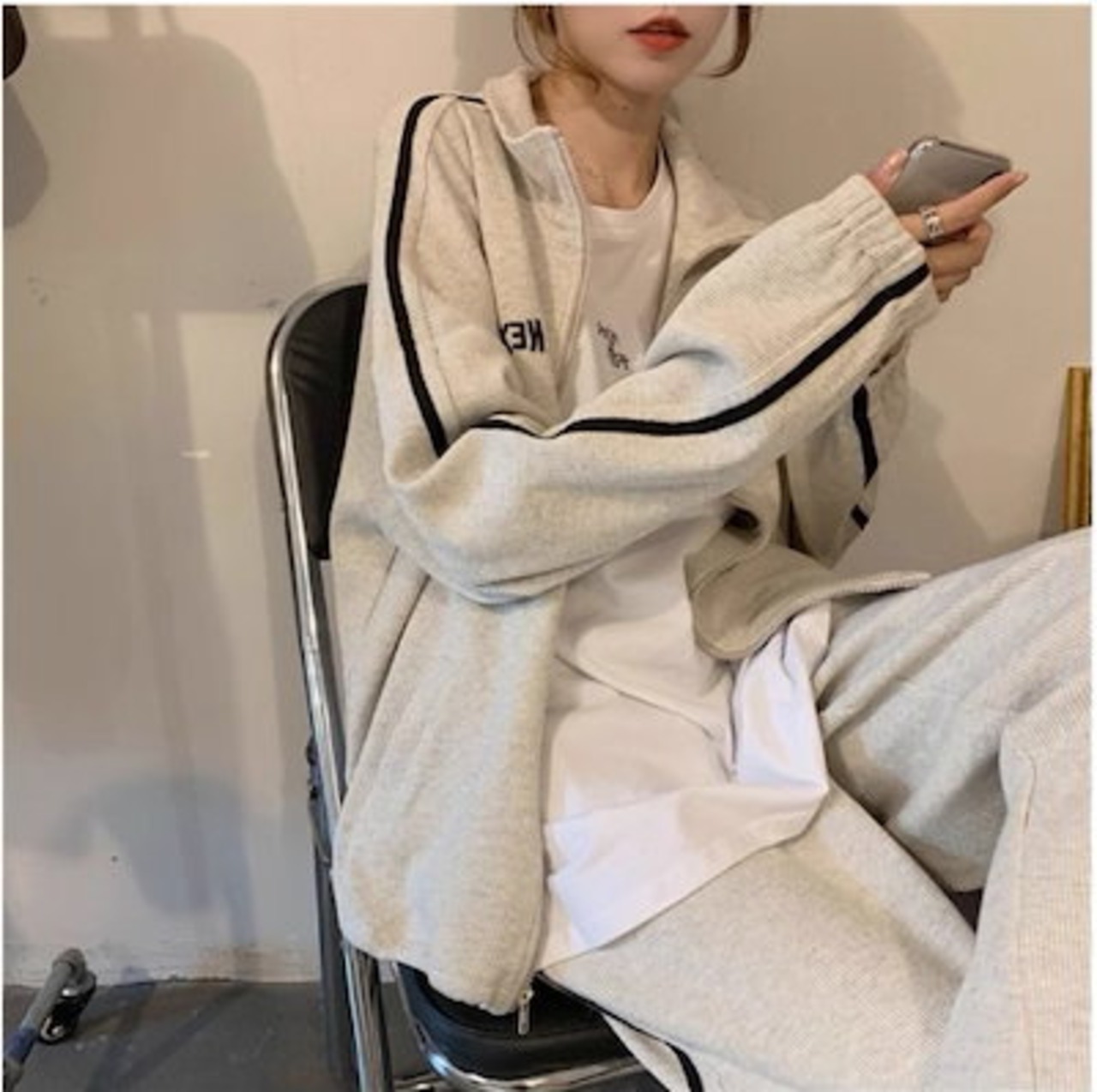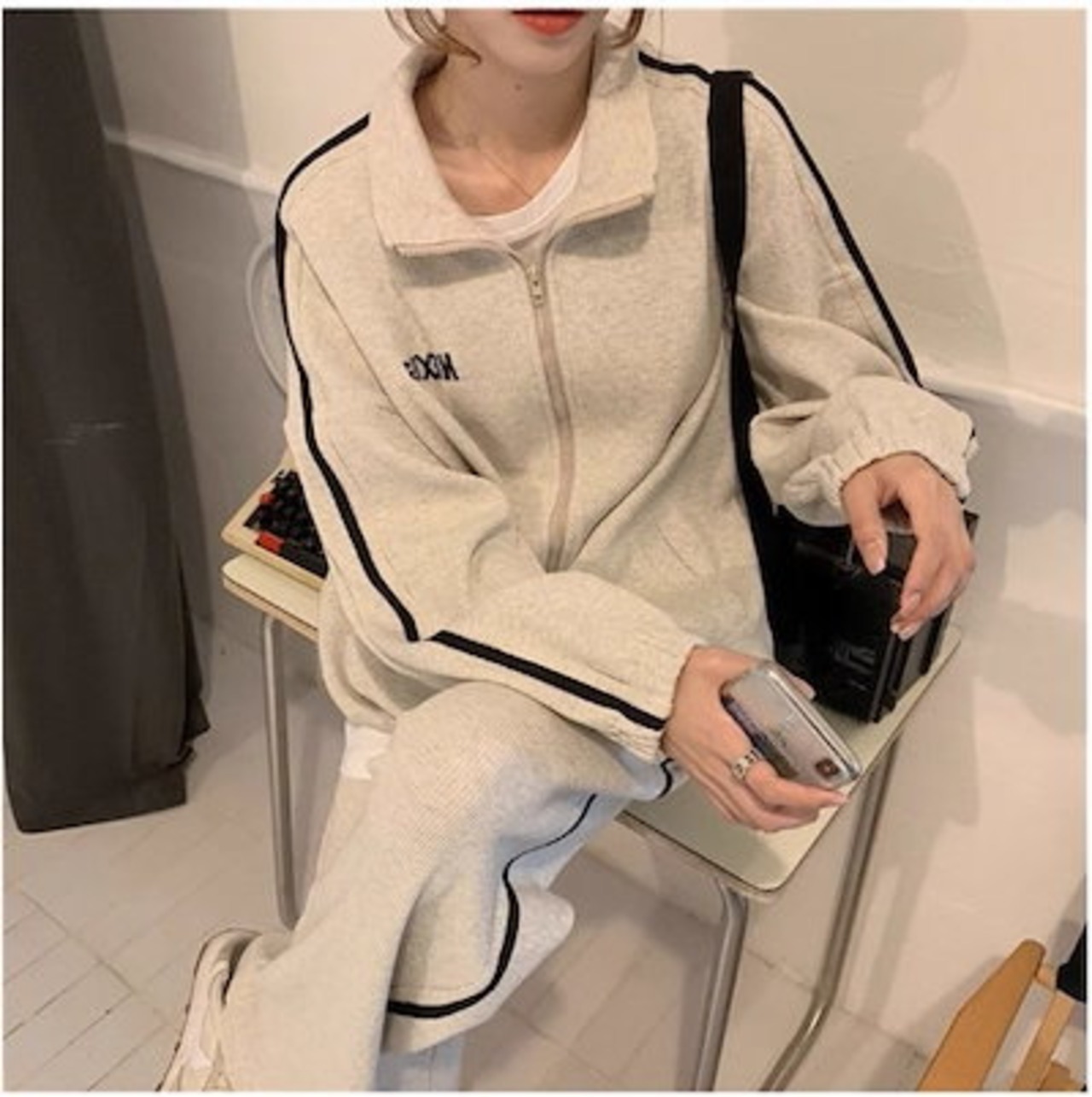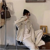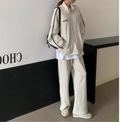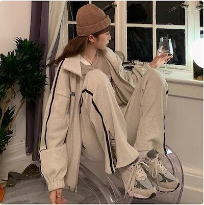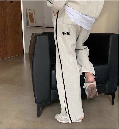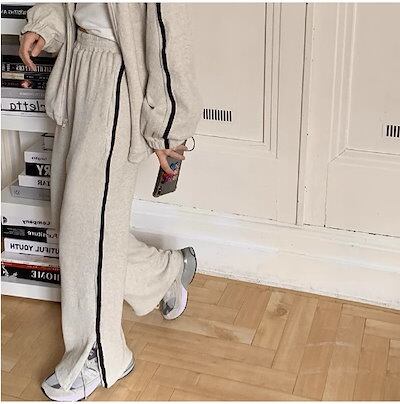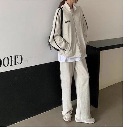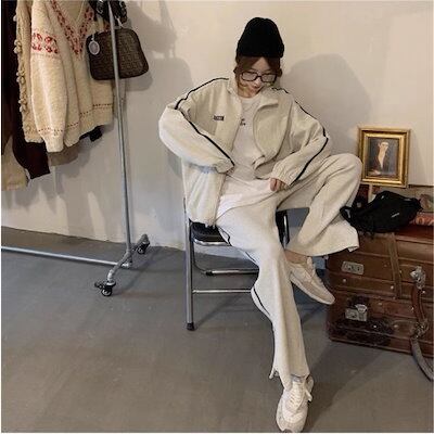 2024 春秋 2点セット トップス お出かけ 羽織り ショート丈 セットアップ フルラウンドヘム ルーズ サイド ボトムス ストレート系冬 ゆったり サイズワイドシルエット リラックストラック