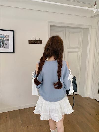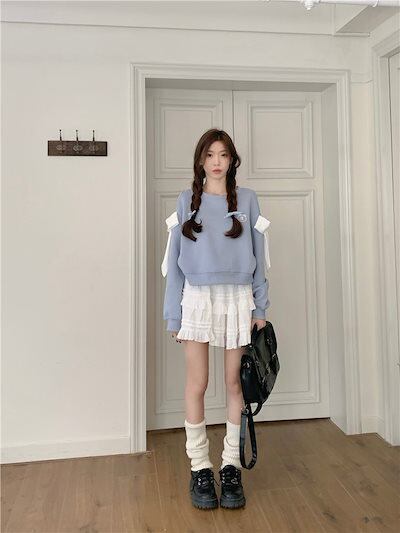 2024秋冬トップス ラウンドネック 長袖 ゆったり 秋 水色 青 ブルー おしゃれ かわいい ラブリー キュート 韓国ファッション オフ レディース お出かけ