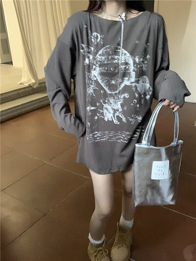 2024 秋冬tシャツ 長袖 ドロップショルダー クルーネック トップス ルーズ レトロ衣装シルエット 韓国系 ファッションサイズ レディース 大人可愛い