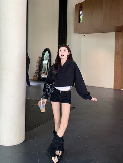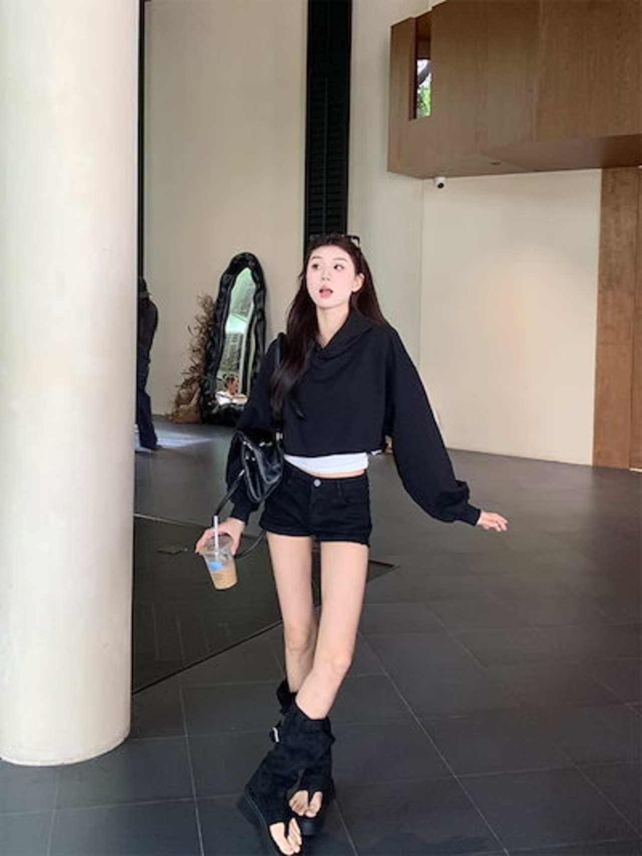 2024 秋冬トップス フード付き スウェット 長袖 丈短め 秋 黒 ブラック おしゃれ かわいい 韓国ファッション レディース お出かけ
