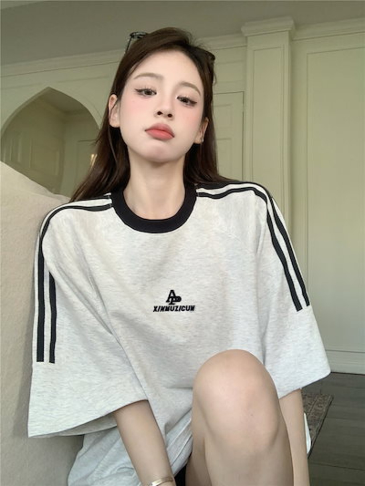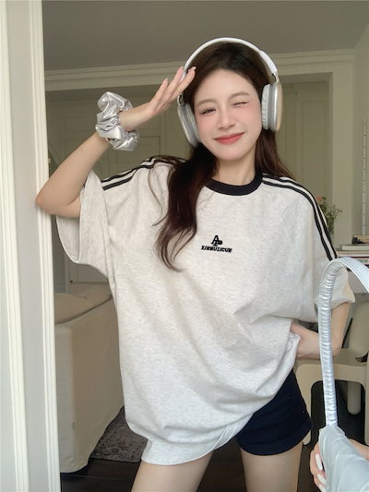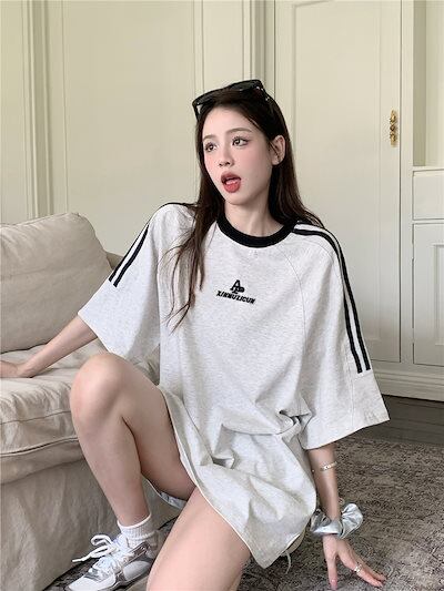2024夏 韓国可愛い風トップス Tシャツ ロング丈 ファッション 半袖スリムフィット サイド ペイントシルエット ゆったり 休日レディースサイズ韓国系ネック黑おしゃれ カジュアル メンズライク T