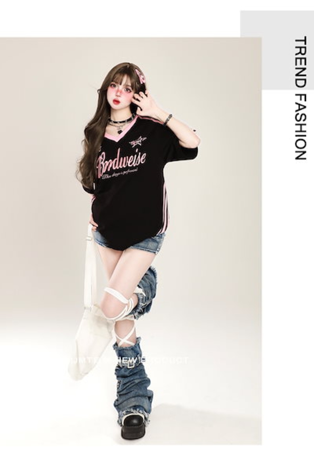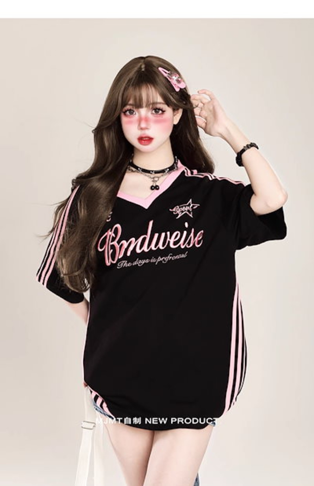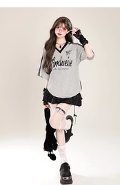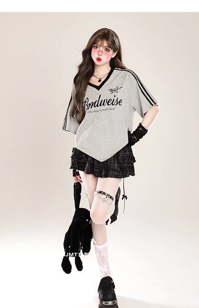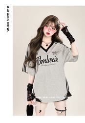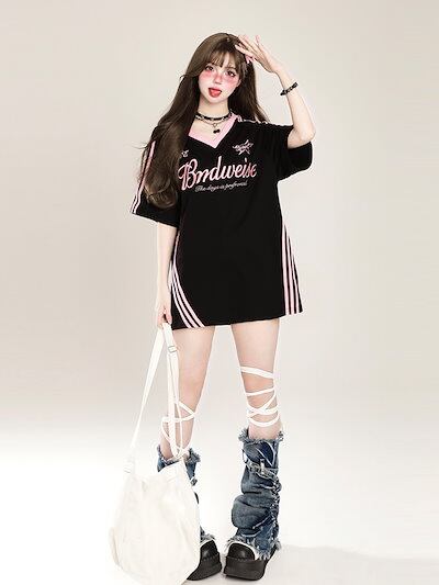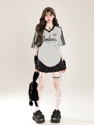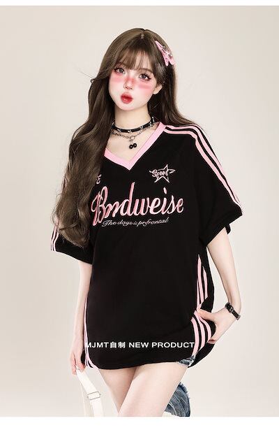 2024夏 韓国可愛い風トップス Tシャツ ファッション系 半袖 スリムフィット サイド ペイントシルエット ゆったり丈 休日レディースサイズ韓国Vネック おしゃれ カジュアル メンズライク T