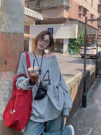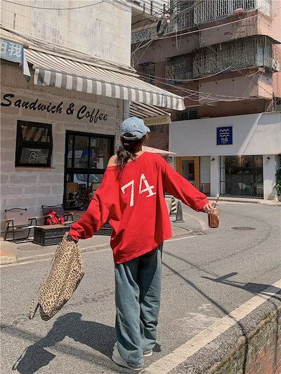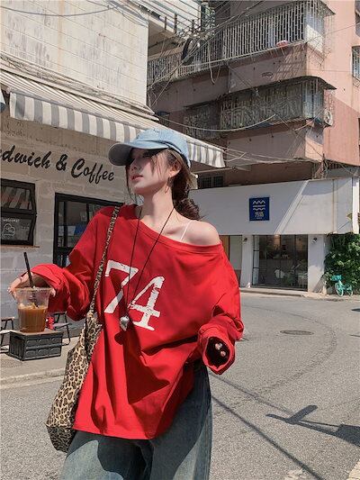 2024夏トップス Tシャツ 長袖 ワンショルダー 肩見せ 数字 74 ゆったり 細見え 夏 赤 おしゃれ かわいい 韓国ファッション レディース お出かけ