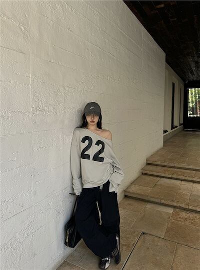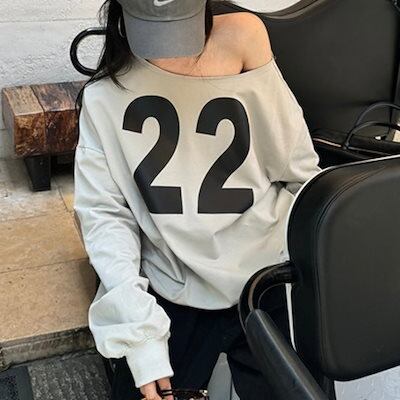 2024 秋冬トップス 長袖 数字 22 肌見せ ゆったり 細見え 秋冬 グレー おしゃれ かわいい 韓国系ファッション レディース お出かけ