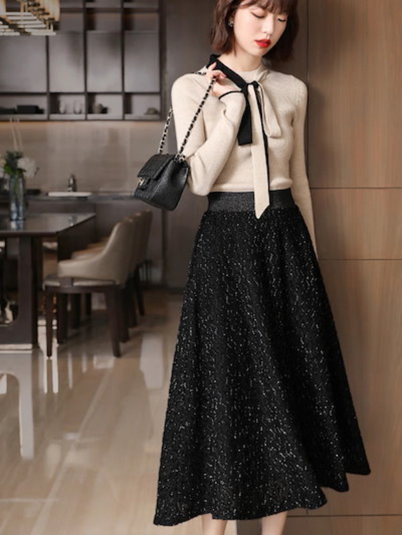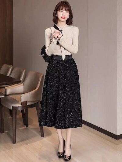 2024 人气 秋 新作 ロングスカート ラフフラワー ツイード 半胴スカート レディース ウエストゴム ラインスカート ミドル丈 春秋 韓国ファッション