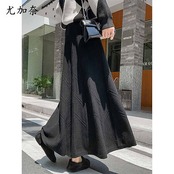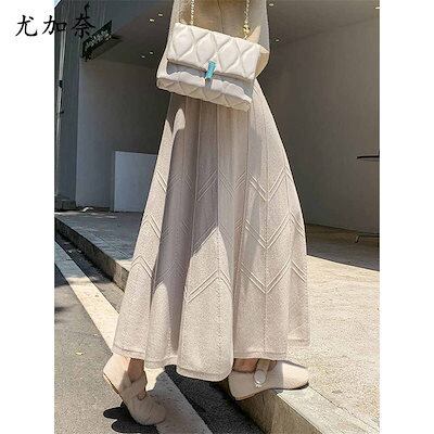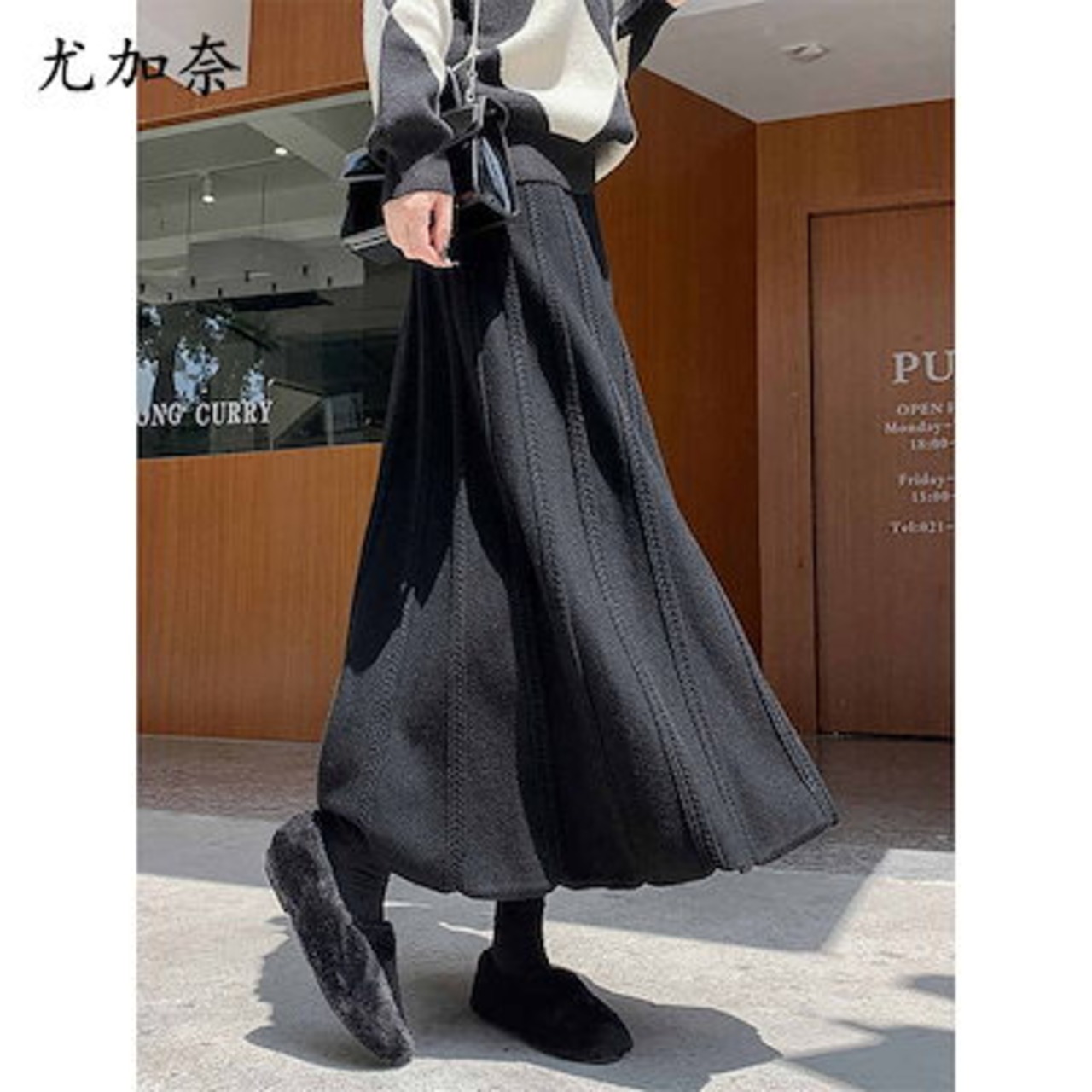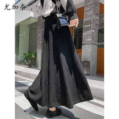 2024 人气 秋 新作 プリーツスカート 黒スカート ハイウエスト ミディアムAニットスカート ロングスカート 百掛け 韓国ファッショ 着痩せ 韓国ファッション