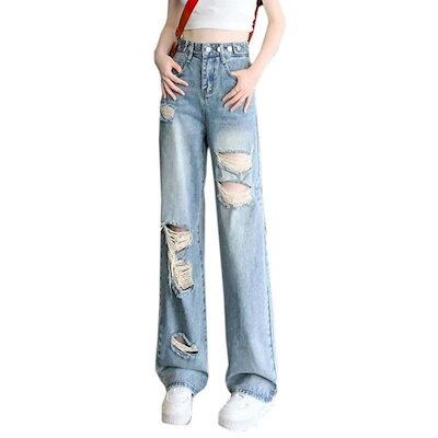 マルチボタンアジャスタブルデニムパンツ 着痩せ 女性乞食デザイン壊れた穴ルーズ夏ハイウエストストレートワイドレッグドラッグパンツ