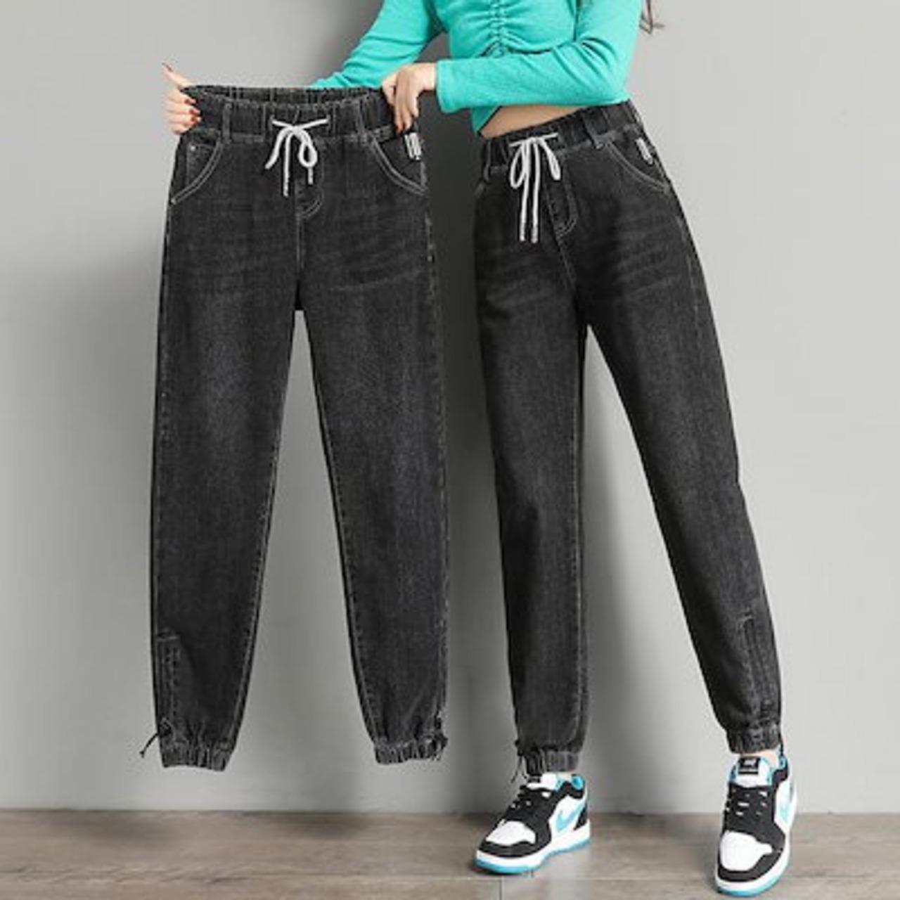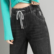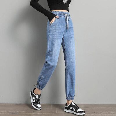 伸縮性のあるウエスト 着痩せ ジョガーパンツ サルエルパンツ デニムパンツ ロングパンツ 長ズボン 脚長効果