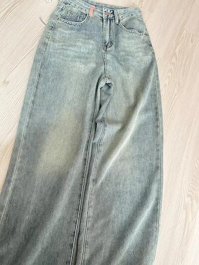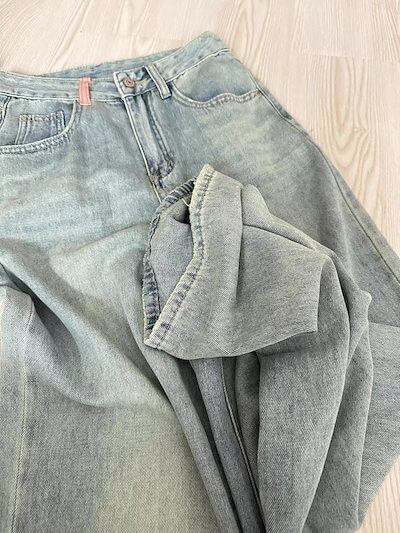 ライトブルー ゆったり ストレートパンツ 脚長効果 デニムボトムス ニューデザイン ハイウェスト 着痩せ デザイン感 ファッション コーディネート ワイドパンツ ジョガーパンツ