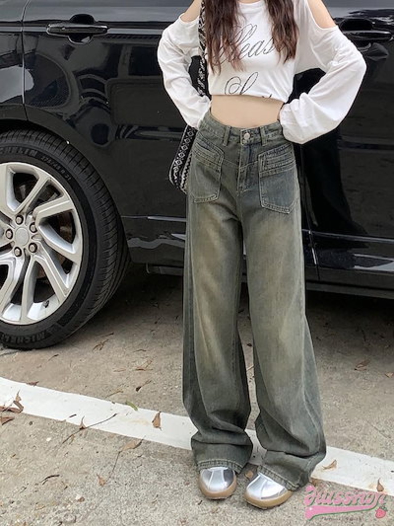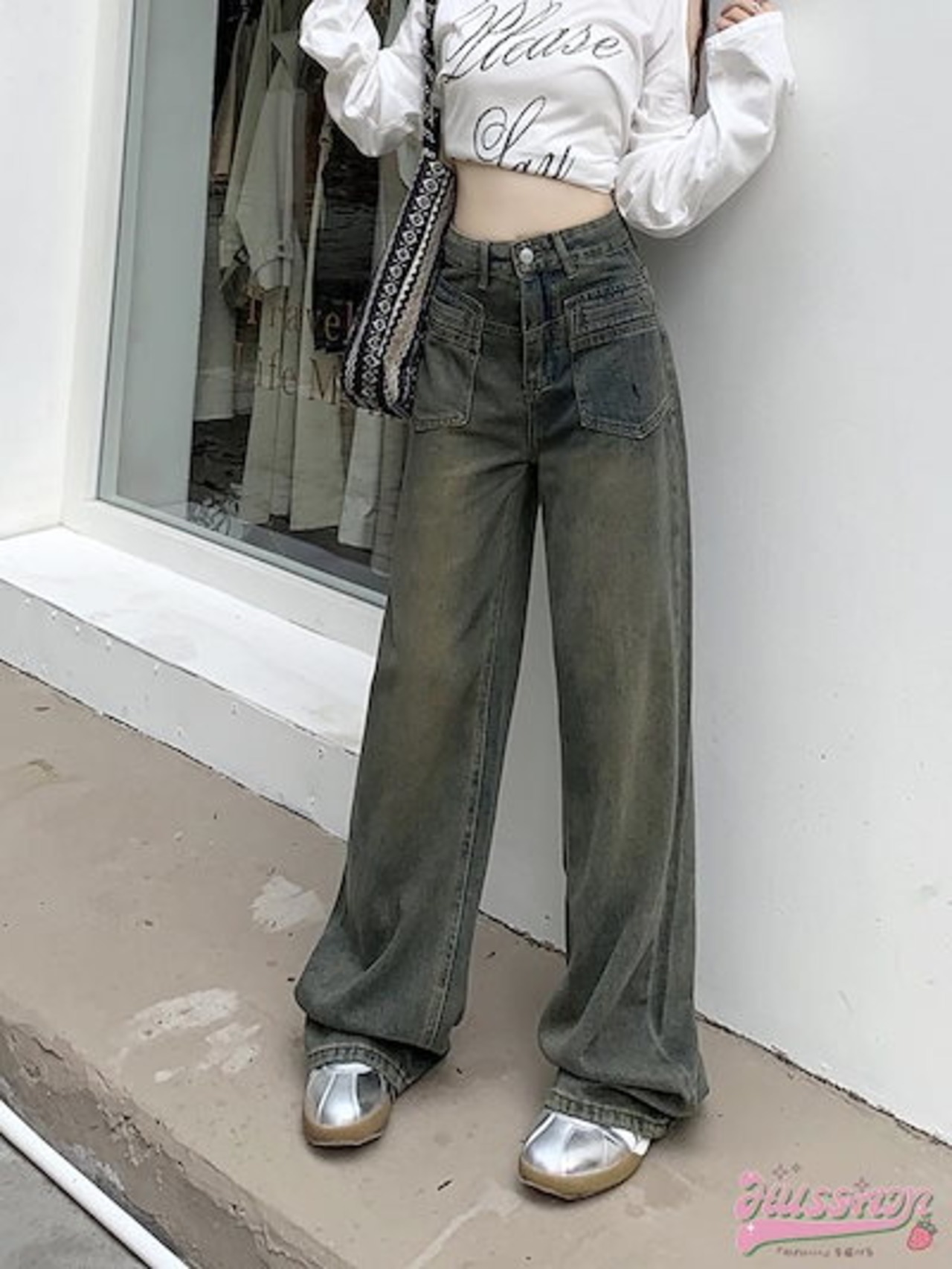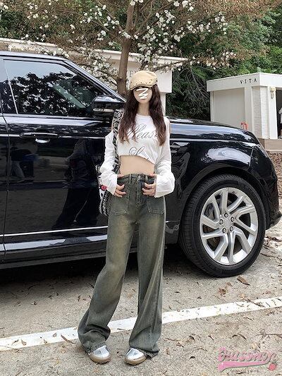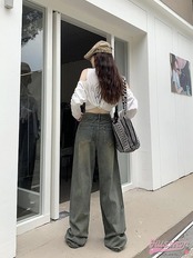 2024 春夏レトロジーンズ女性春秋脚長効果新作ハイウエスト薄型デザインワイドパンツストレートドラッグズボン潮