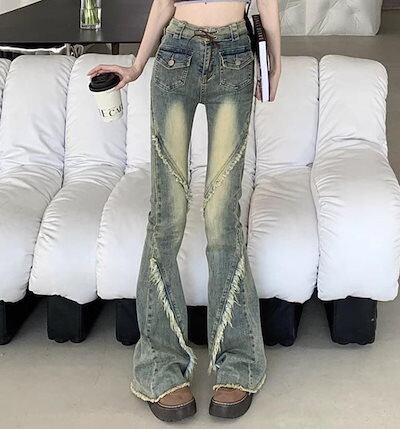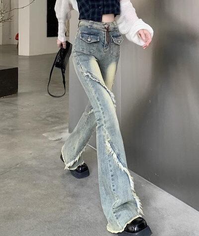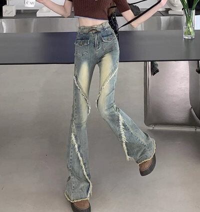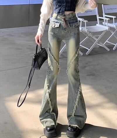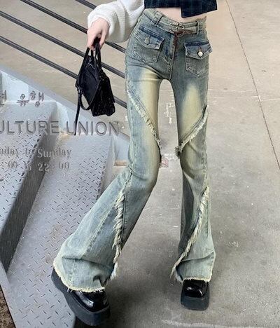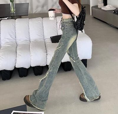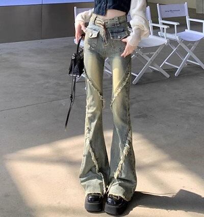 2024春夏 アメリカン パンツ デニム ブルー ジーンズ 脚長効果 ロング丈 スキニー レッグ加工 ハイウエスト美脚効果 細見え 秋 カジュアル 韓国ファッション お出かけ1