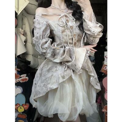 涼しく楽ちんセットアップ 水墨ぼかしバンドヒョウタンスリーブレースリボン染めシャツ+ハイウエストポンポン半身スカート 可愛い 2点セットサンタコスプレ
