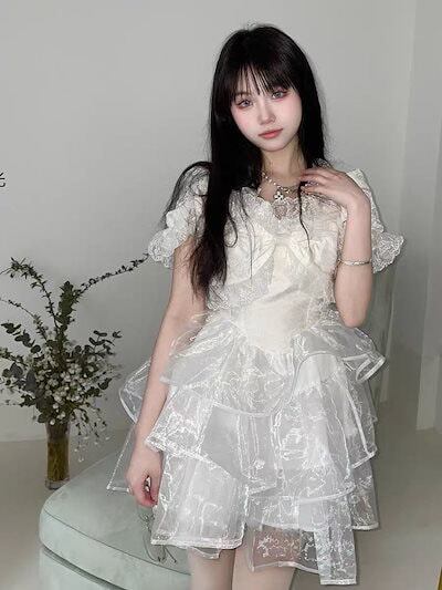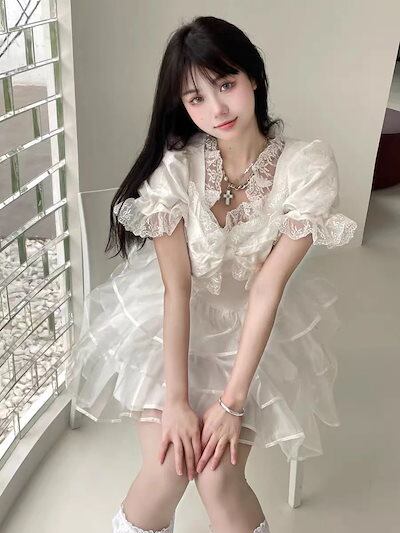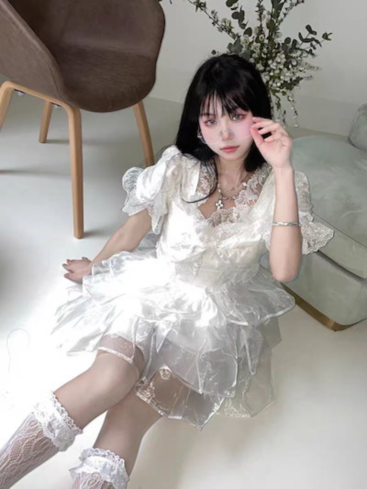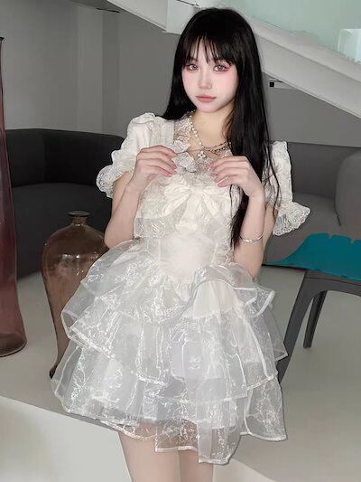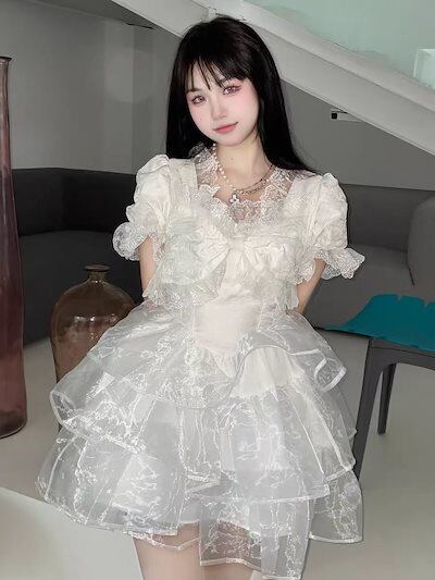 ロリータ コスプレ 2024新作 夏 ロリータ 着痩せ ワンピース ホワイト レース ポンポンスカートサンタコスプレ