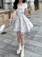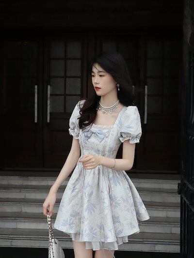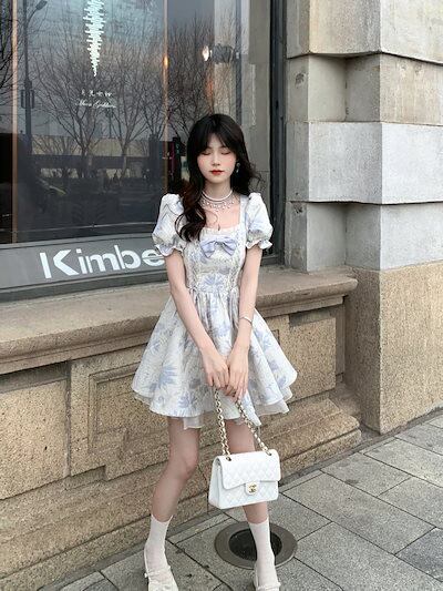 ロリータ コスプレ 2024新作 夏 ロリータ ワンピース ブルー 蝶結び 着痩せ スクエアネック 可愛いサンタコスプレ