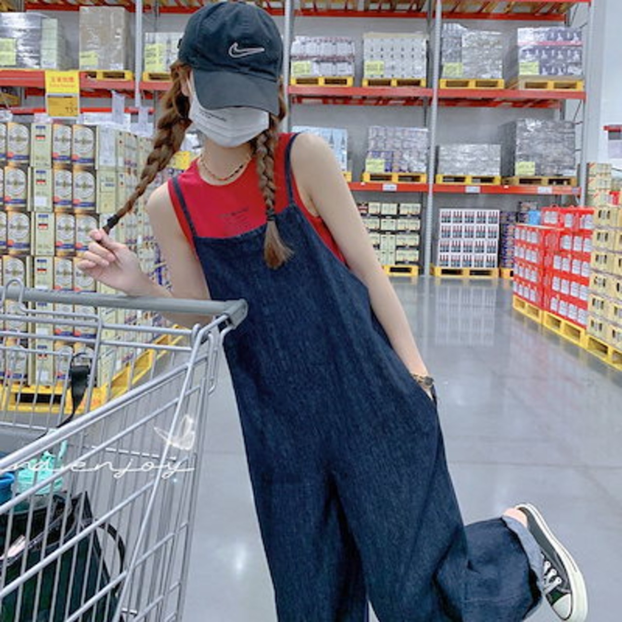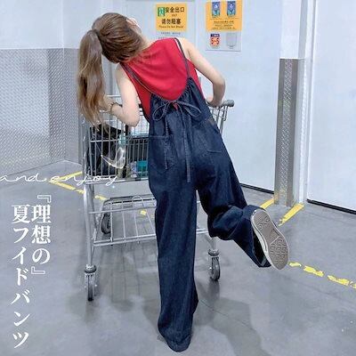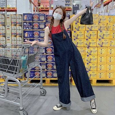 秋コディネート韓国ファッション デニム オーバーオール /秋 着痩せ ジーンズ / ワイドパンツ レディース 百掛け サロペット / ノースリーブ ストレートパンツサロ