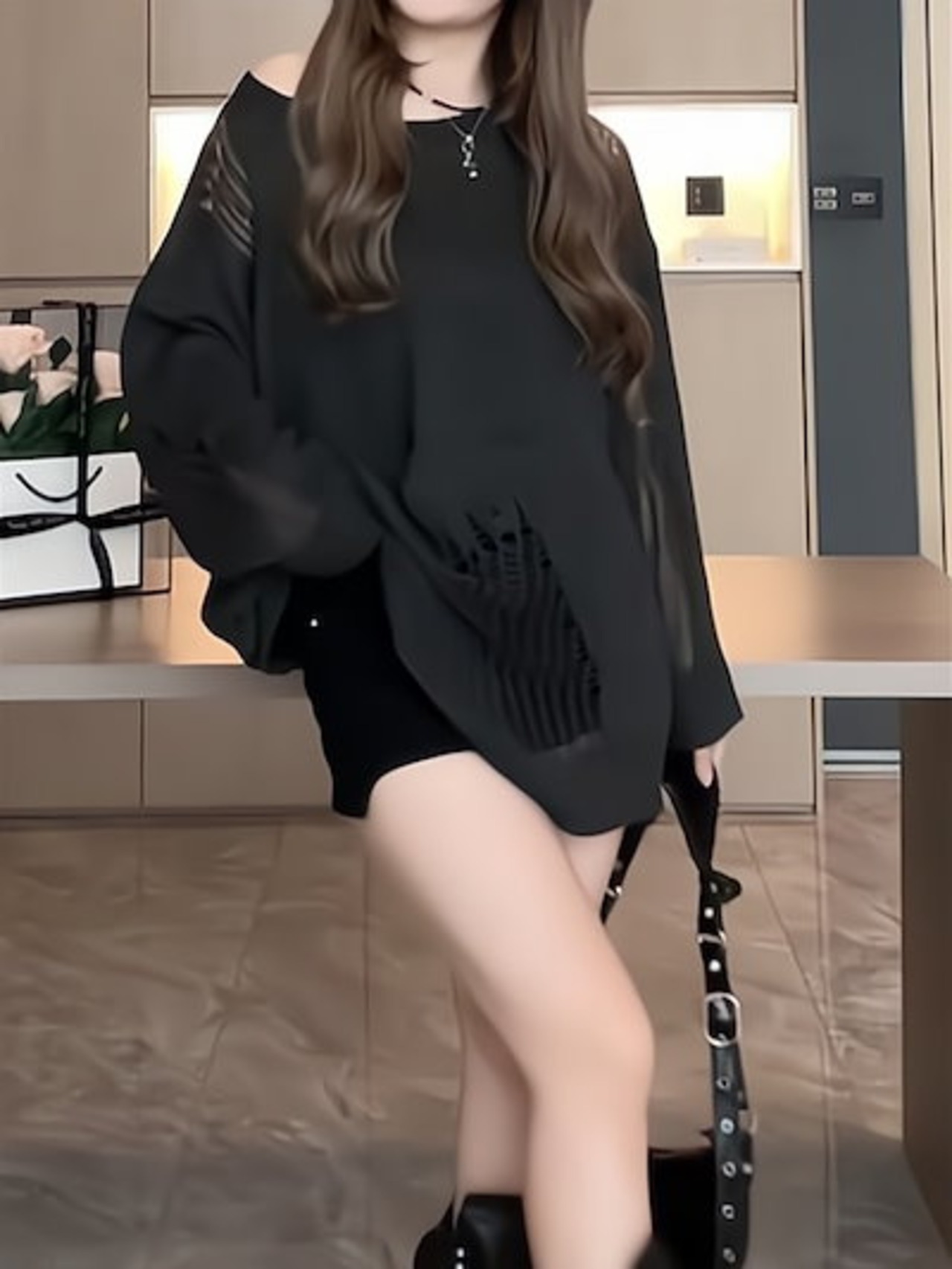 2024秋冬 長袖 ニット トップスストリート黑カジュアエコルシルエットプルクルーネックファッション加工色っぽ 女っぽ カジュアル 大人っぽ 上品 サイズフェミニンゆったりレディース系透かし編み