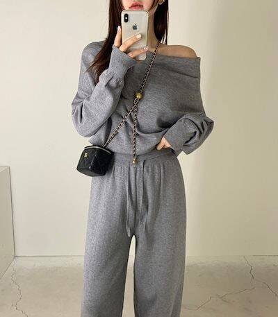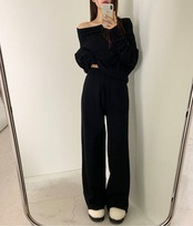2024秋冬セットアップ トップス ニット長袖 ワンショルダー ロングパンツ ワイド ストレート ゆったり 秋 白 黒 おしゃれ かわいい 韓国ファッション レディース お出かけ