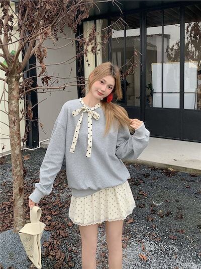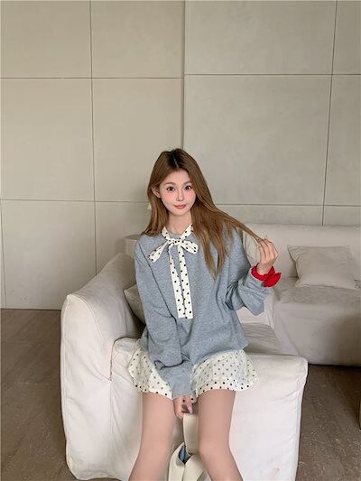 2024秋冬トップス 長袖 ラウンドネック スカート ミニ丈 ドット柄 ゆったり 秋 白 黒 おしゃれ かわいい ガーリー キュート 甘め 韓国ファッション レディース お出かけ