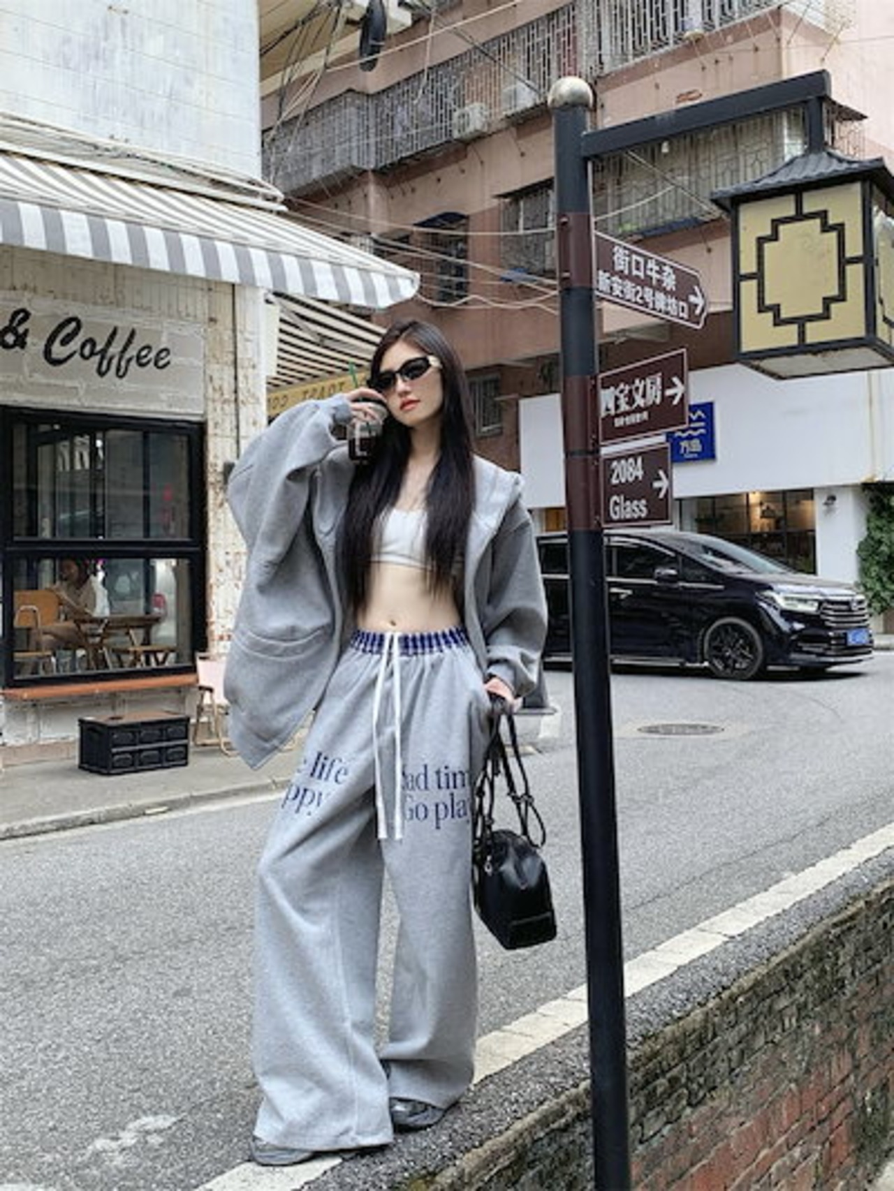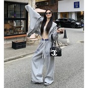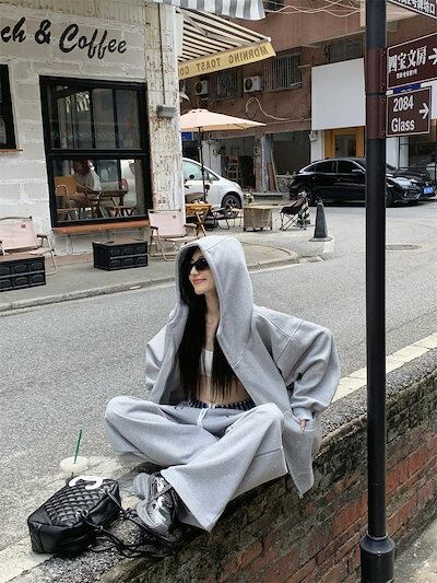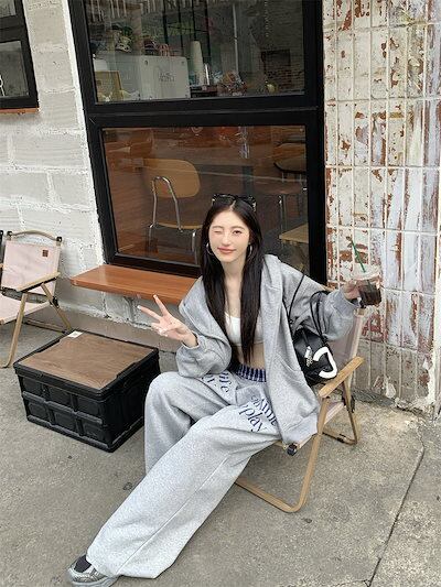 2024 春秋 2点セット トップス お出かけ 羽織り ショート丈 セットアップ フルラウンドヘム ルーズ サイド ボトムス ストレート系冬 ゆったり サイズワイドシルエット リラックストラック