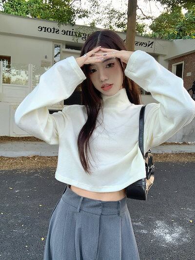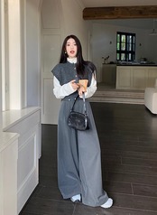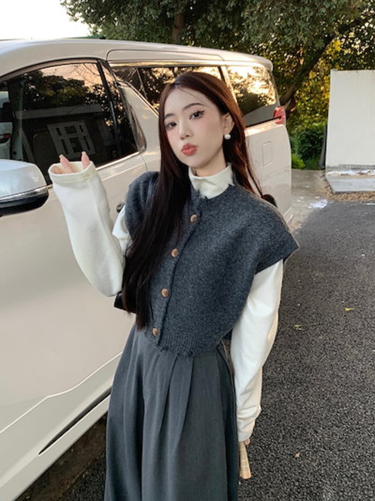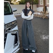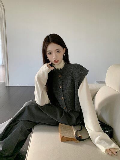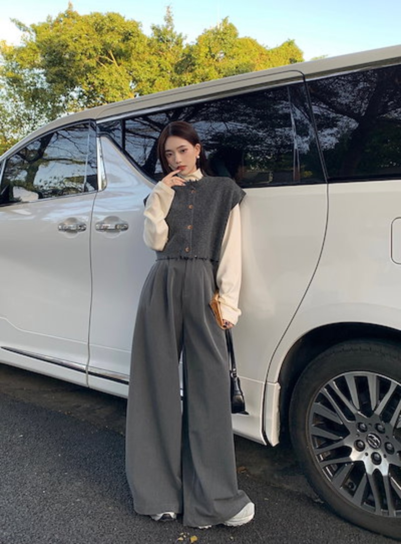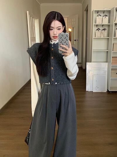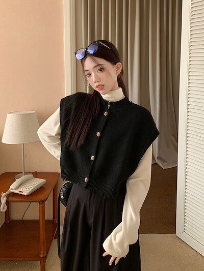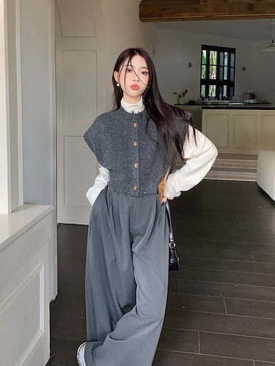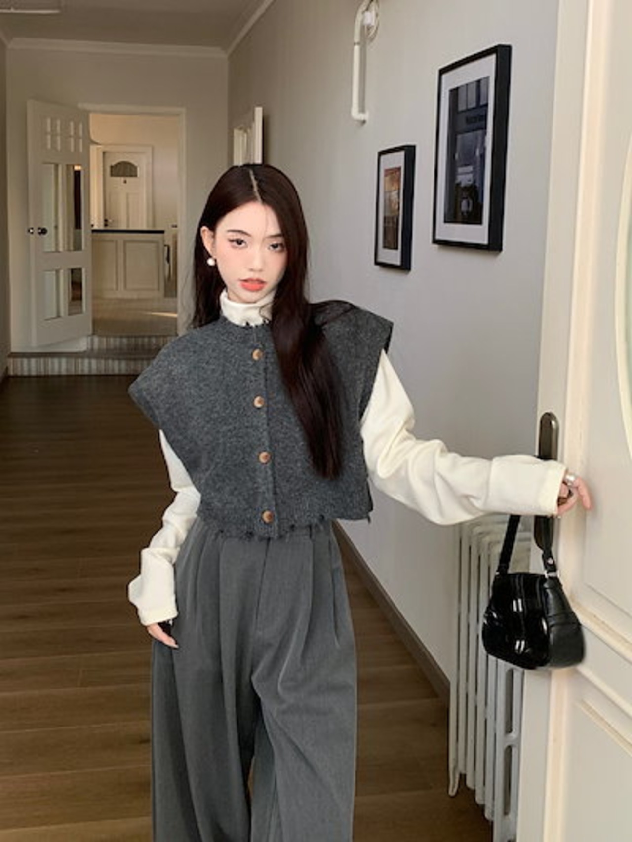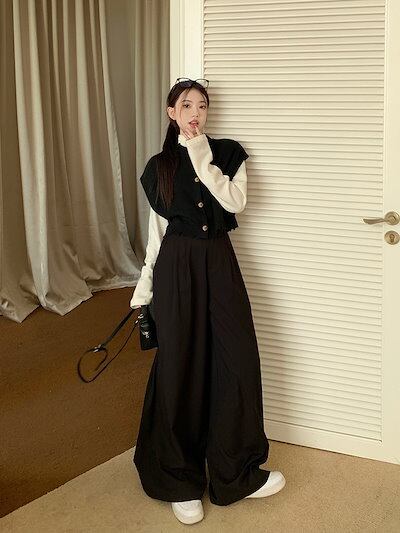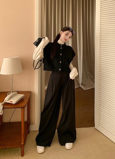 2024秋冬 重ね着風 ショート丈 レイヤード トップスニットベスト ハイネックレディース 3点セット Vネック ノースリーブ カジュアル ワイドパンツ ホワイト クール 通勤オフィスきれいめ上下