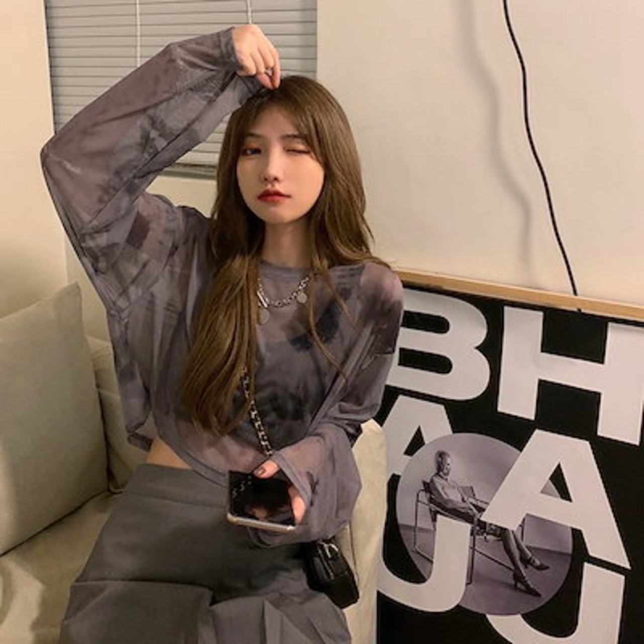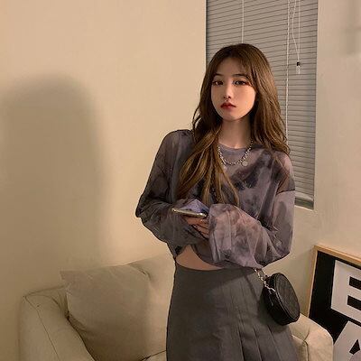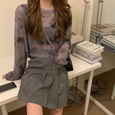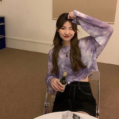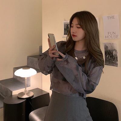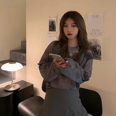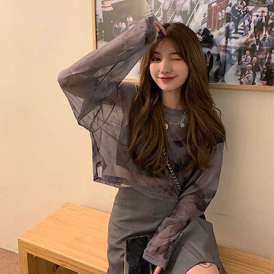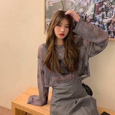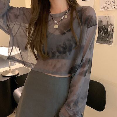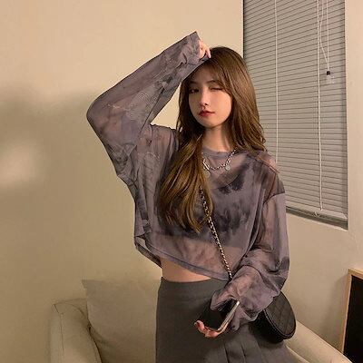 2024 夏 韓国 女度を格上げ tシャツ ファッション トップス 薄手 韓国系 長袖 薄手フィット プリント レイヤード 重ね着 肌見せ 女っぽハイフレンチタイト丈 レディース T
