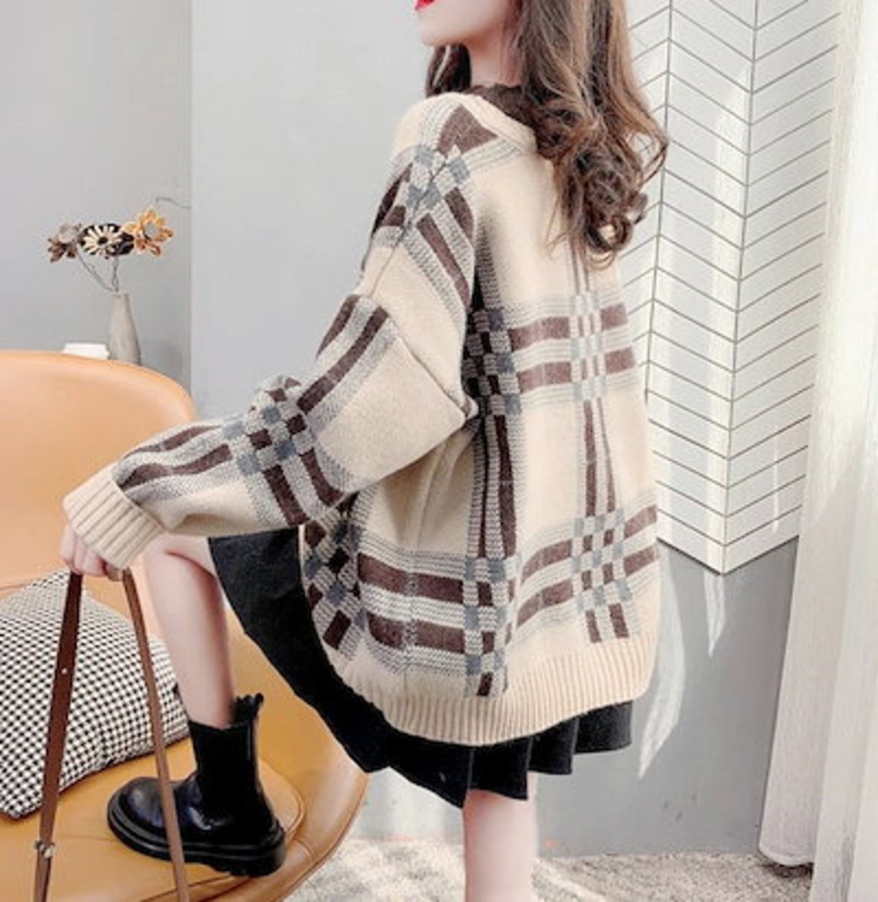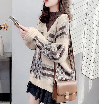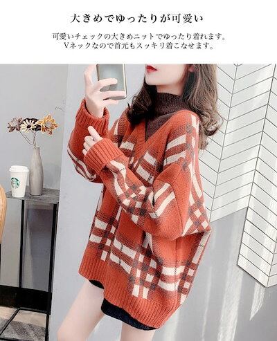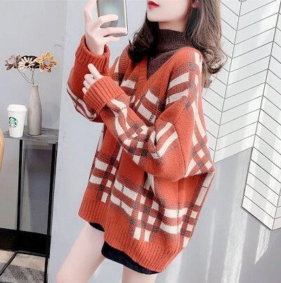 ニット 重ね着風 ェック柄 オーバーサイズ 切り替え 秋冬 Vネック ニット トップス 大き目 カーディガン セーター レディース ハイネック ゆったり 長袖チ