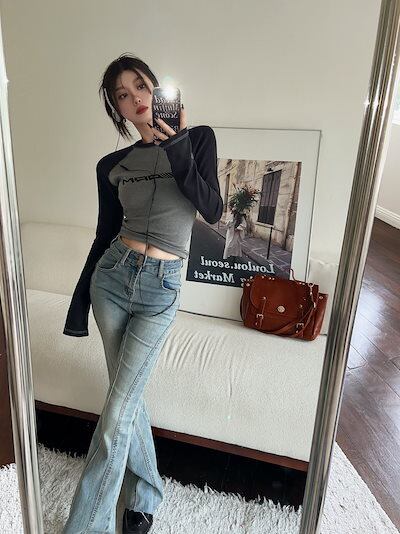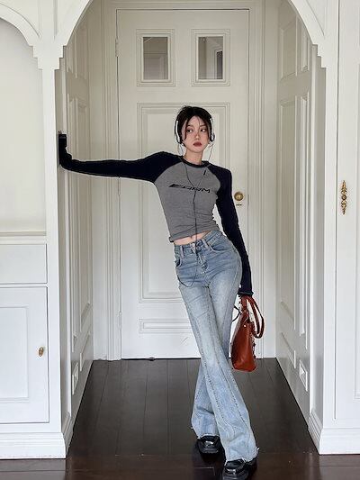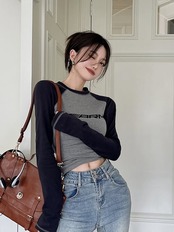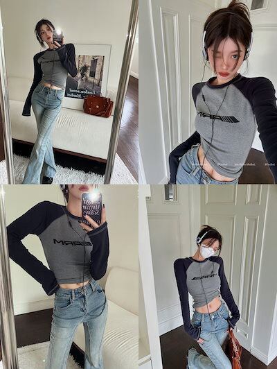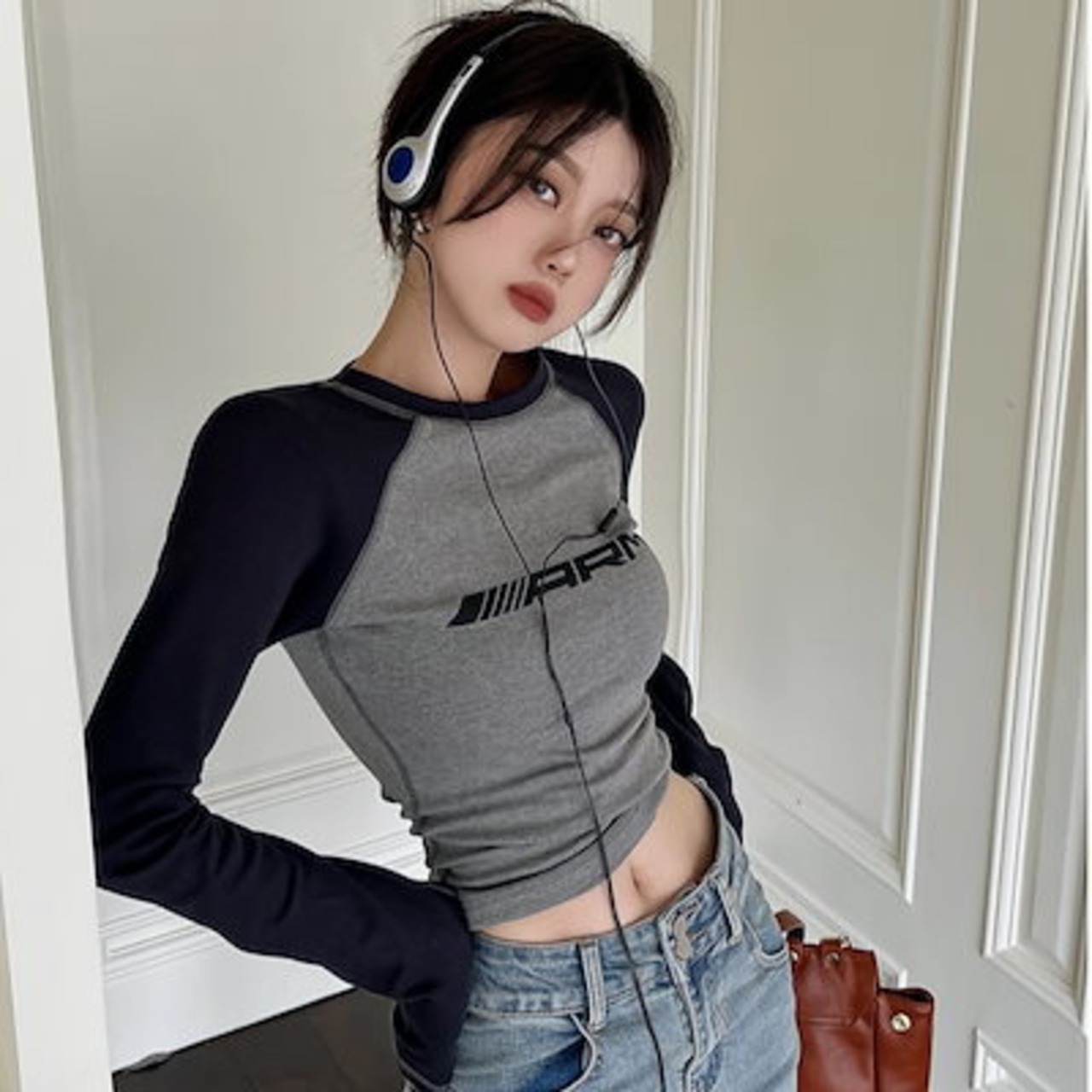 2024春夏 トップス 長袖 可愛い おしゃれ タイトフィット カットソー ラウンドカラー 重ね着丈 スリーブ 女っぽ レディース Tファッション系 フェミニン きれいめ 色っぽ プリント