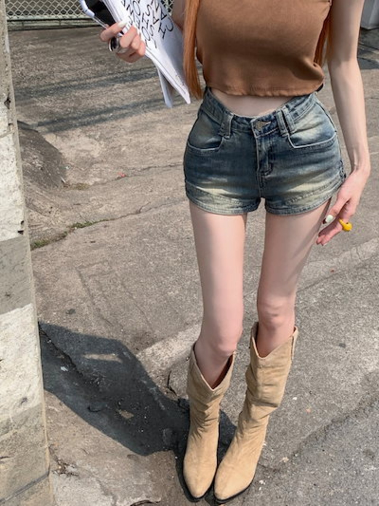 2024 春夏パンツ ショート丈 デニム ジーンズ スリム スキニー ウォッシュ加工 ハイウエスト 美脚効果 脚長効果 細見え 夏 おしゃれ かわいい 韓国ファッション レディース お出かけ