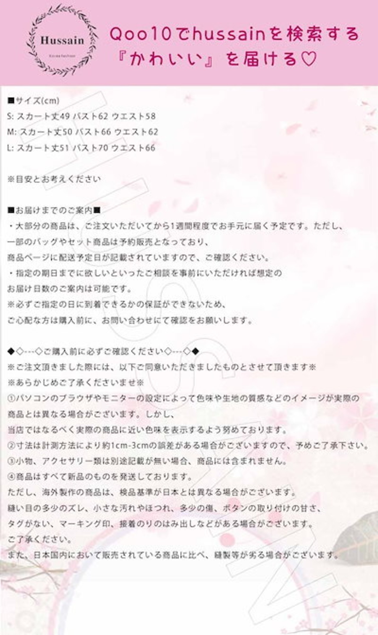 サイズ交換、お色交換などの返品、交換は行っておりませんので十分にお確かめの上、ご購入お願い致します。