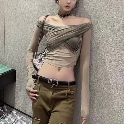 2024 春夏トップス 長袖 Tシャツ 韓国 レイヤード風 着痩せスリムかわいいネックフレンチセクシーラウンドネックおしゃれスリーブカジュアルコーデショート丈ファッション系レディースお出かけ T
