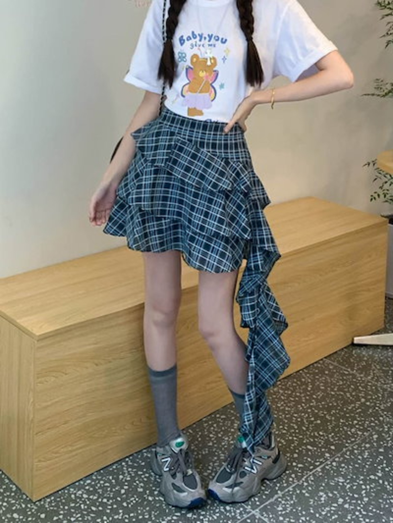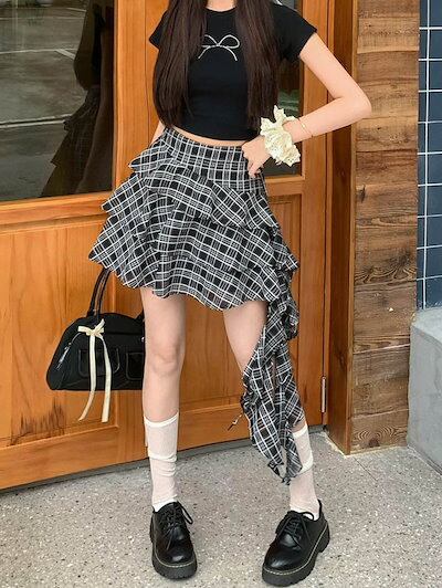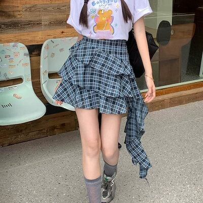 2024春夏スカート ミニ丈 チェック柄 不規則 ハイウエスト 美脚効果 脚長効果 細見え 夏 おしゃれ かわいい 韓国ファッション レディース お出かけ