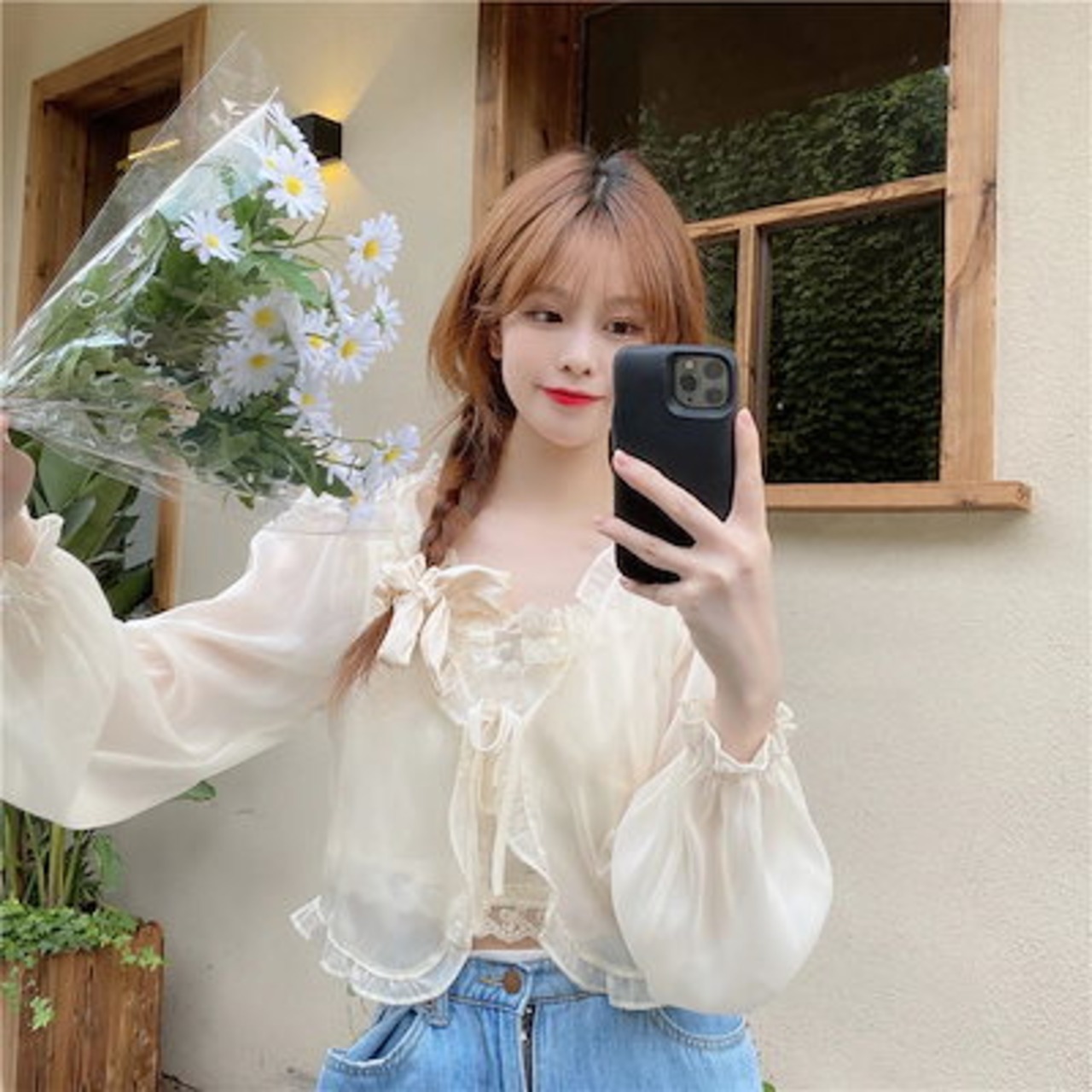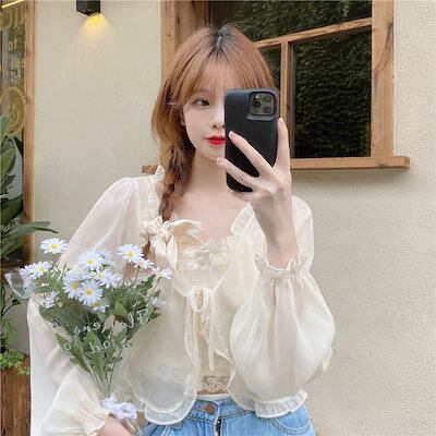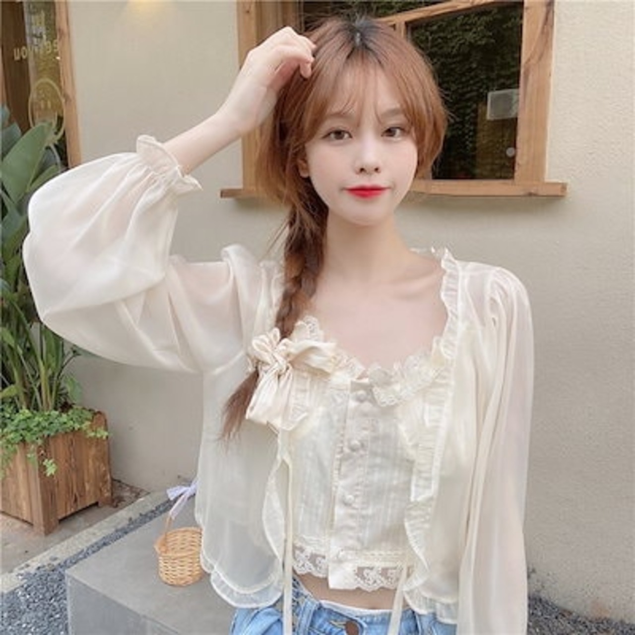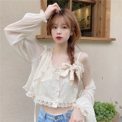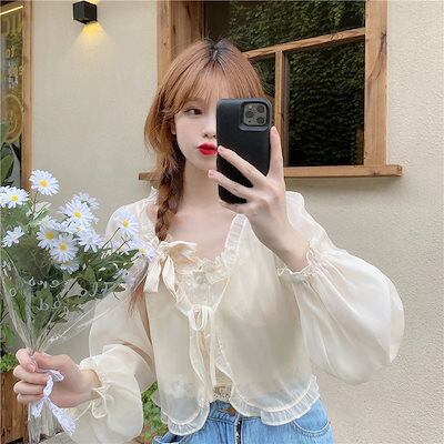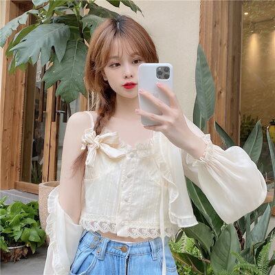 2024 夏 韓国 ショート丈 薄手透かし編み 2点カーディガン トップス長袖紫外線対策 UVカット冷房羽織り加工きれいめライトニット オフィス OLへそ出し フレンチシースルーファッション韓国レディ