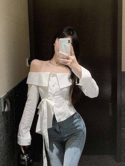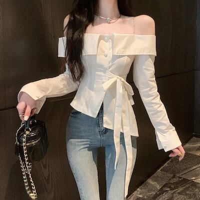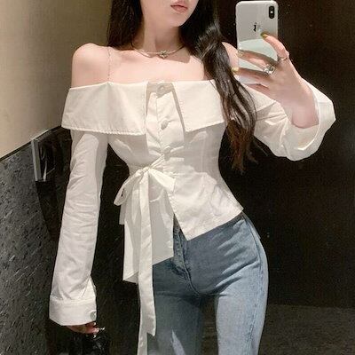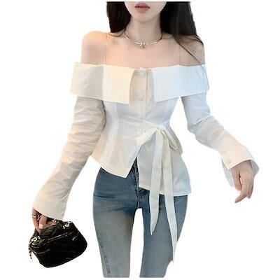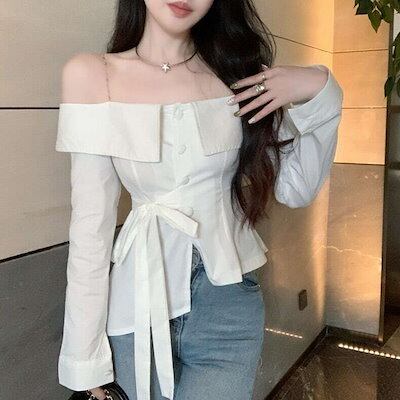 2024春夏オフショルトップス オフショルダー ウエストリボン シャツ トップス 無地 ホワイト 肌見せ エレガント 韓国ファッション