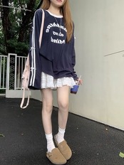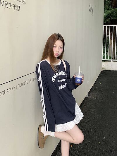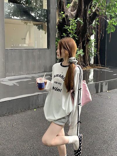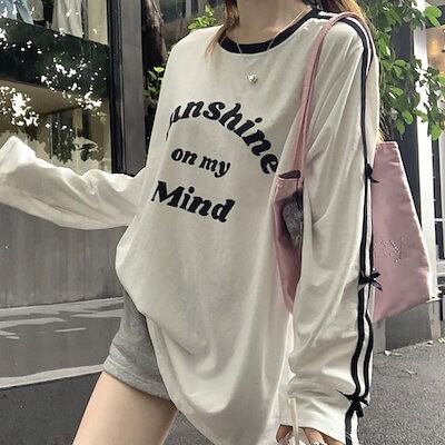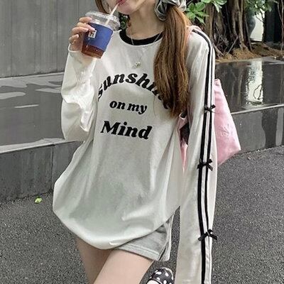 2024 春夏トップス Tシャツ 長袖 ラウンドネック 丈長め ゆったり ストライプ 英語風 細見え 夏 白 カジュアル おしゃれ かわいい キュート 韓国ファッション レディース お出かけ T