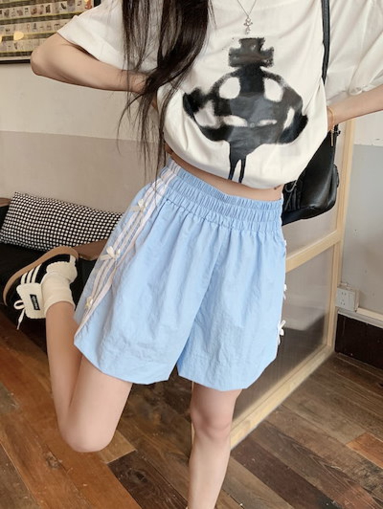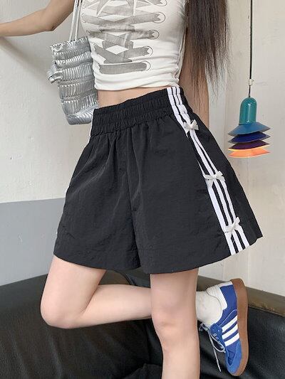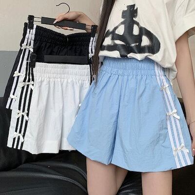 2024 春夏パンツ ショート丈 ワイド ウエストゴム ハイウエスト 美脚効果 脚長効果 細見え 短パン 黒白 おしゃれ かわいい 韓国ファッション系 レディース サイドお出かけ