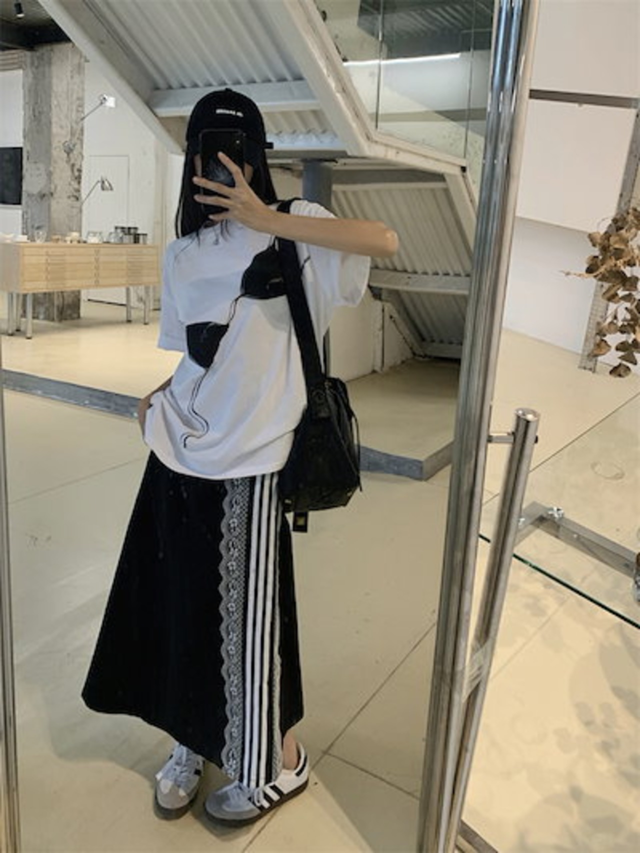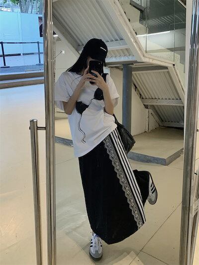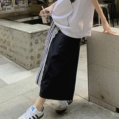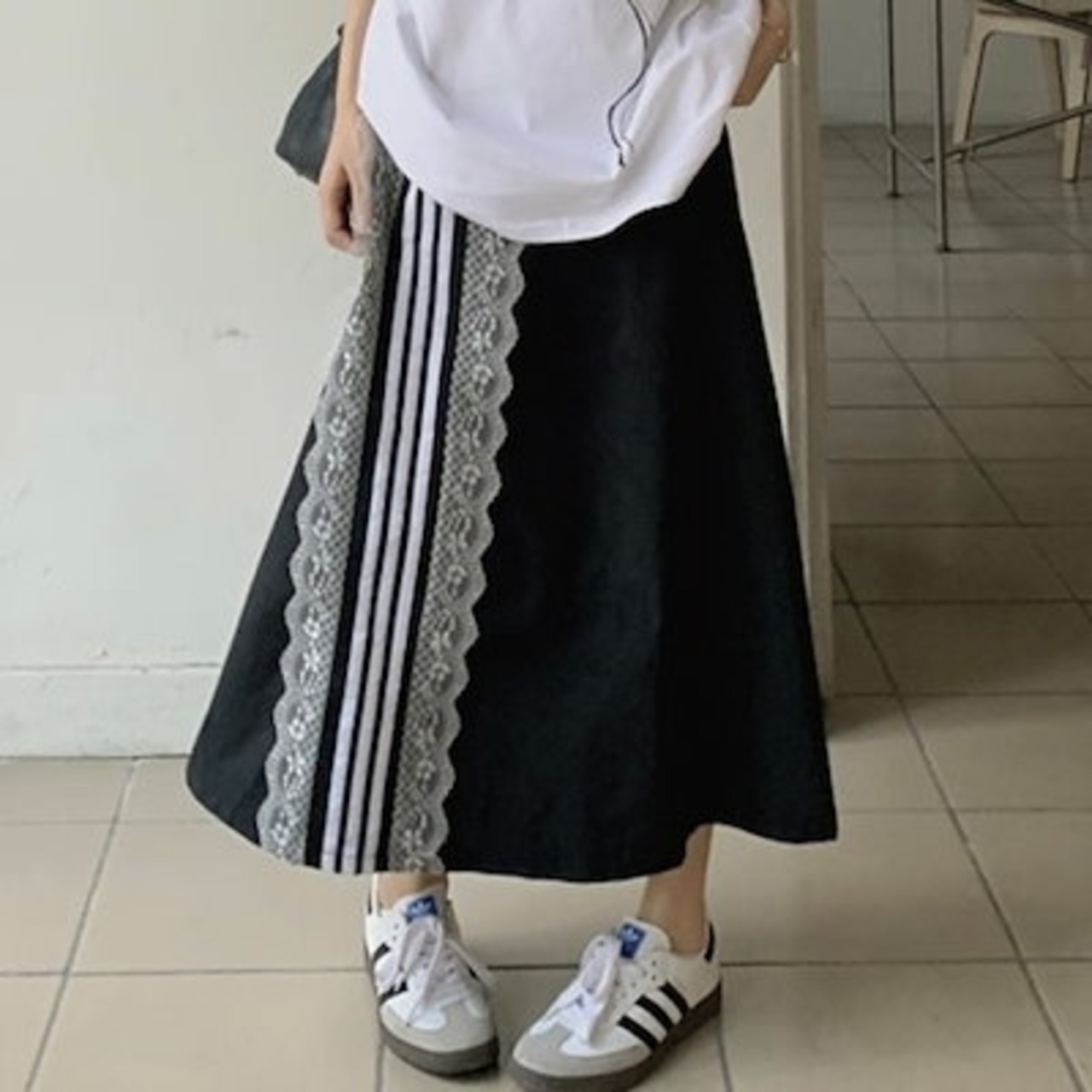 2024 春夏スカート ロング丈 Aライン ストライプ レース ハイウエスト 美脚効果 脚長効果 細見え 夏 黒 ブラック おしゃれ かわいい 甘辛 韓国ファッション レディース お出かけ