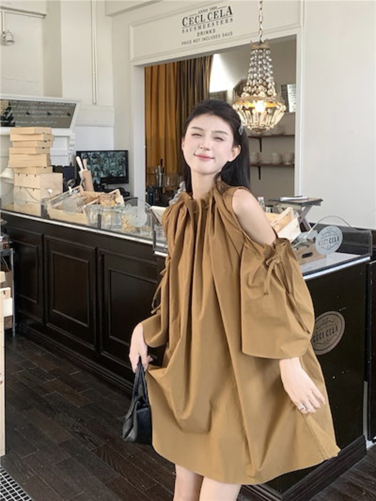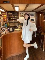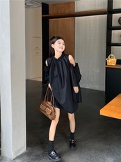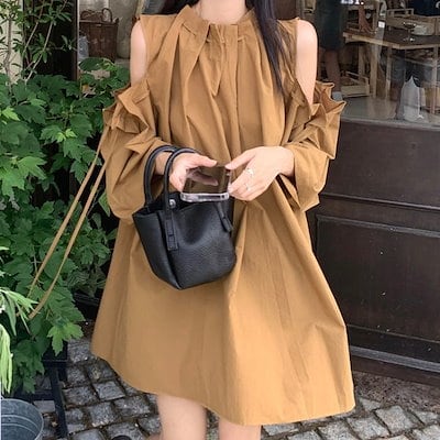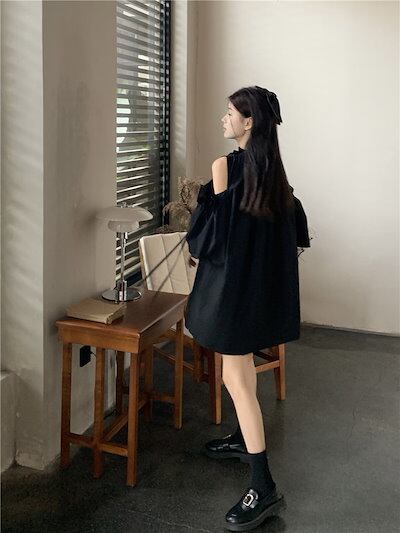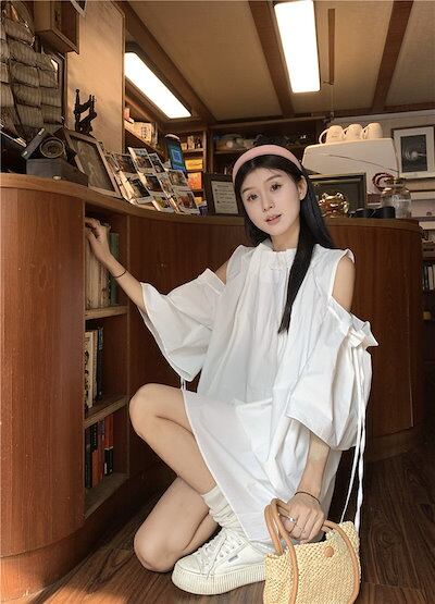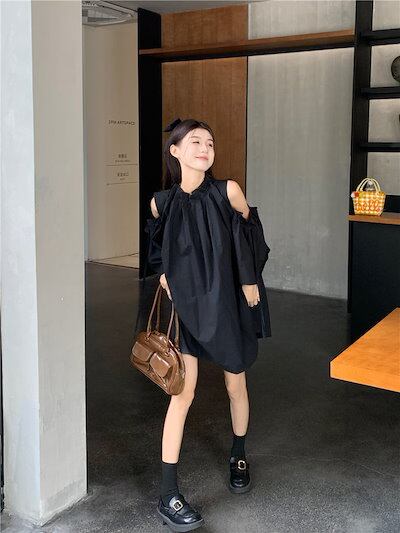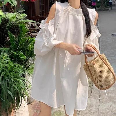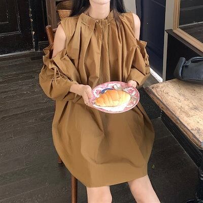 2024 夏 韓国ワンピース ミニ丈 ラウンドネック ノースリーブ オープンショルダー ゆったり 細見え 夏 茶色 黒 白 おしゃれ かわいい キュート 甘め カジュアル 韓国ファッション レディース