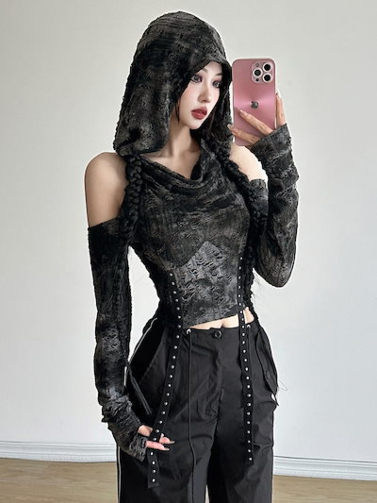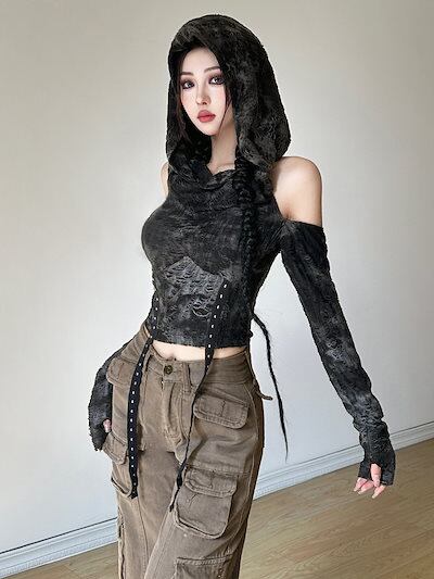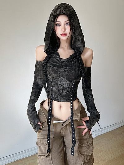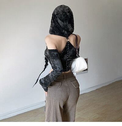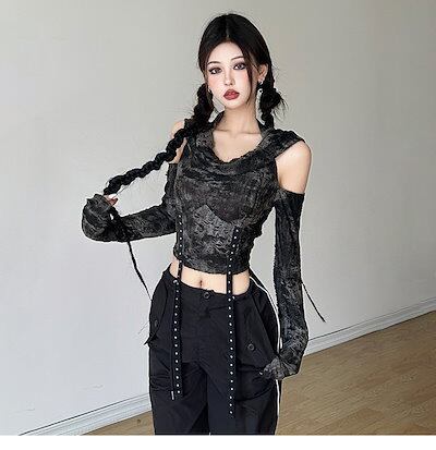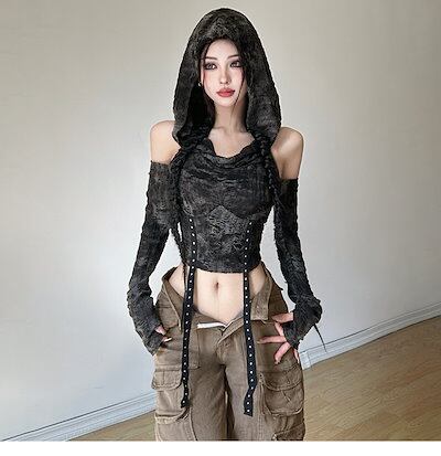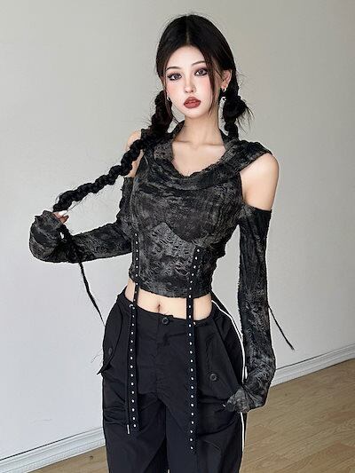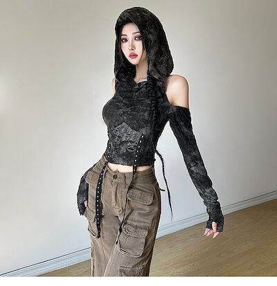 2024 春夏トップス Tシャツ 韓国 ラウンドネック 長袖フード付き 着痩せ ショート スリム おしゃれ カジュアル風コーデ丈 ファッション系レディース 加工お出かけ T