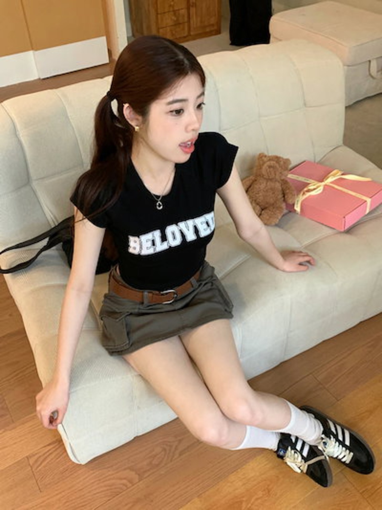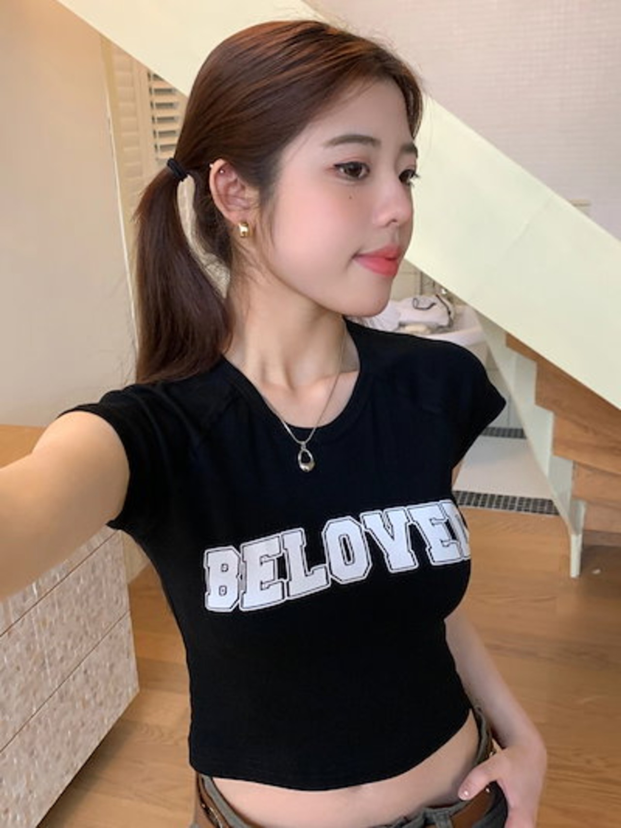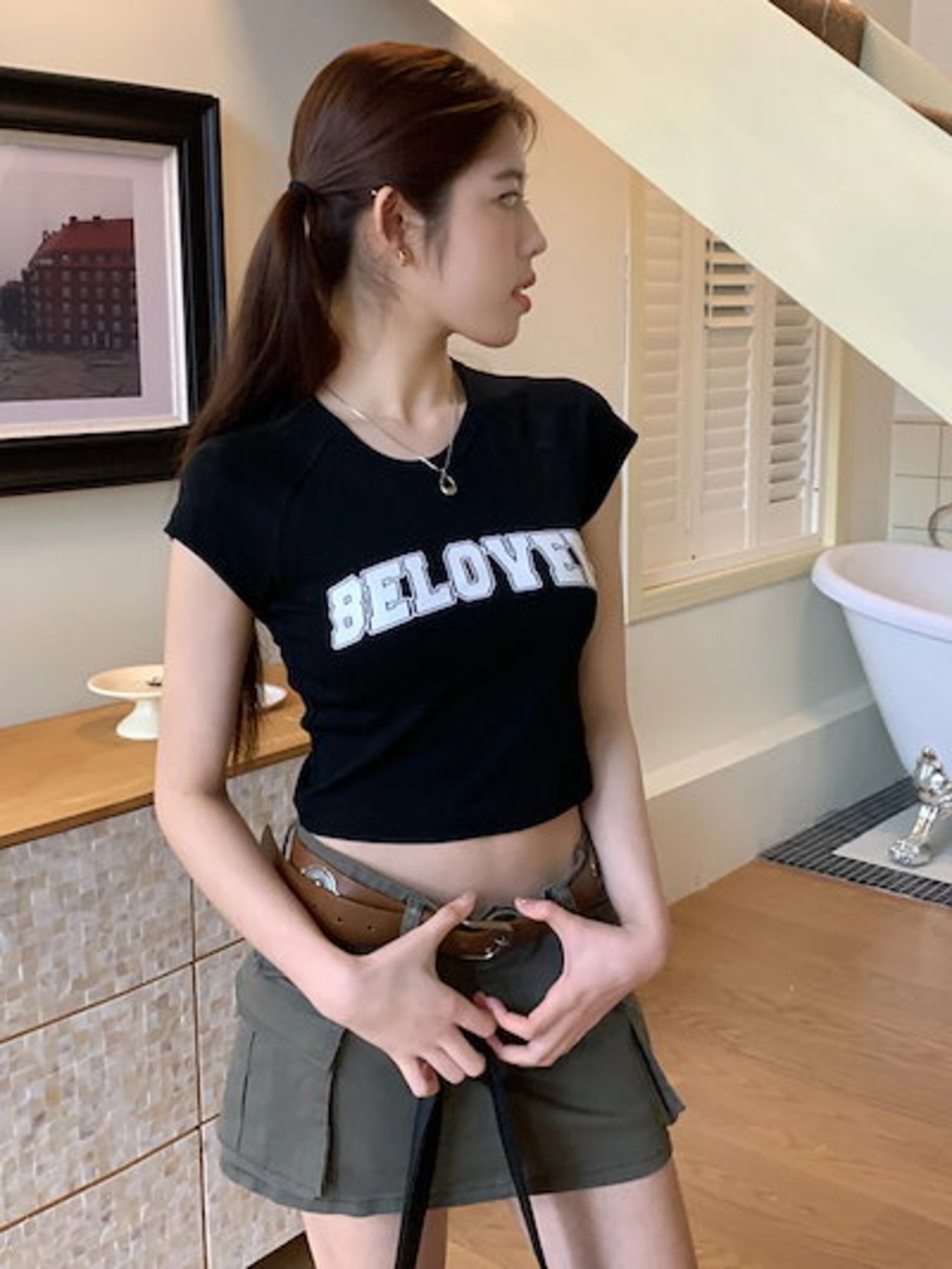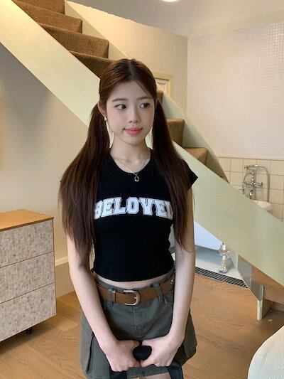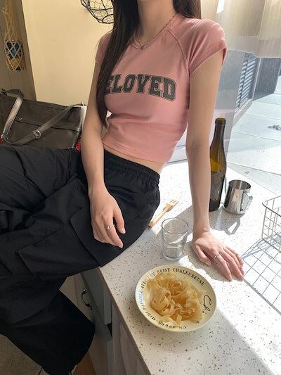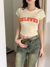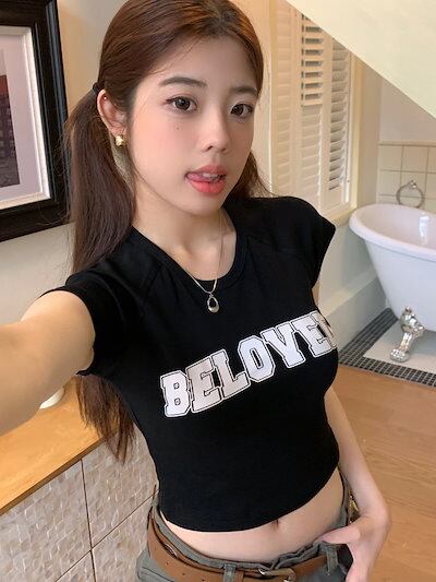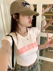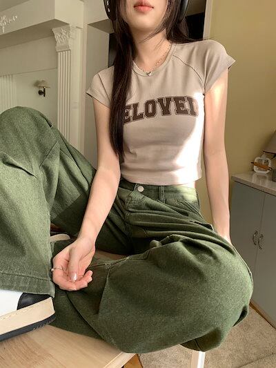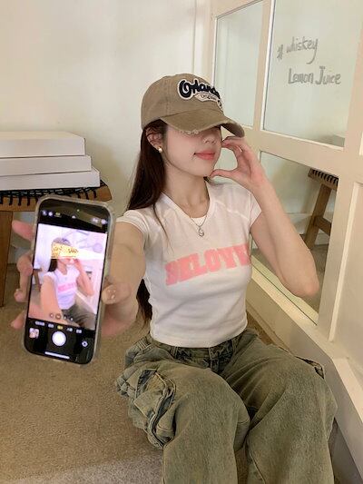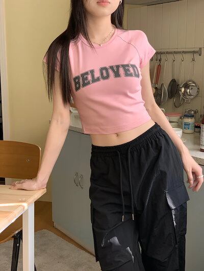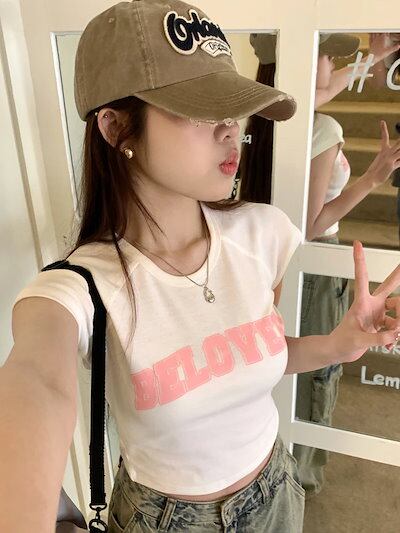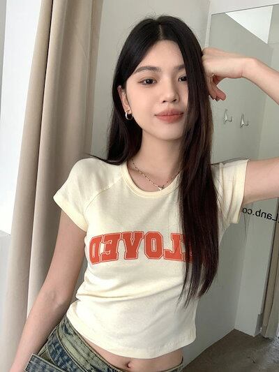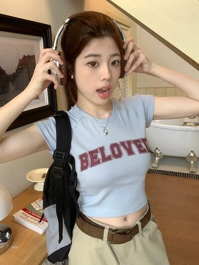 2024 春夏 甘い トップス Tシャツ ラウンドネック丈 休日 フレンチ 韓国系 ブラウス ファッション タイト スリムフィット丈短め ショート レディース 休日 おしゃれ T
