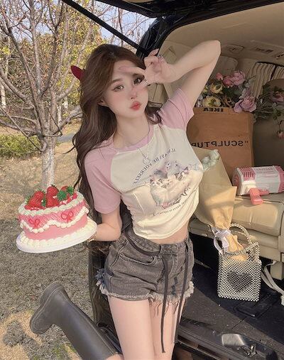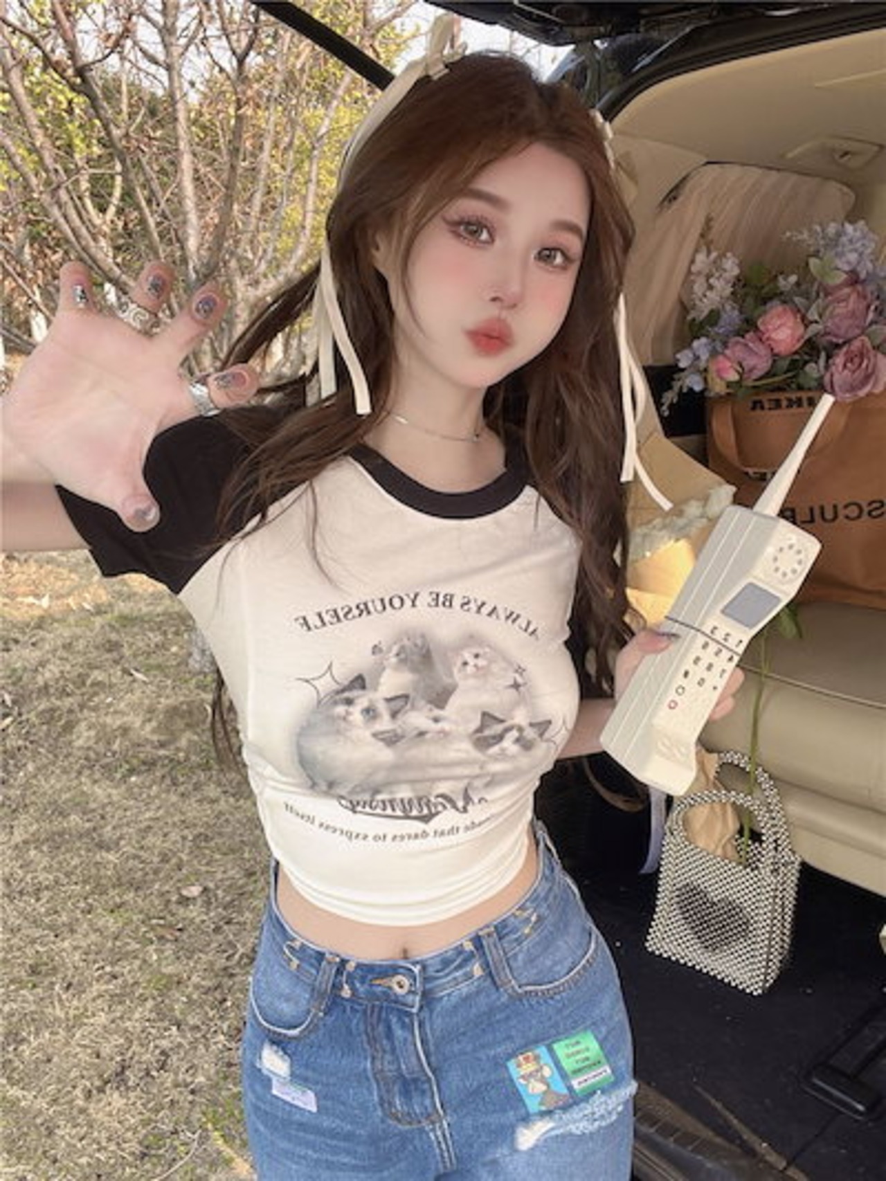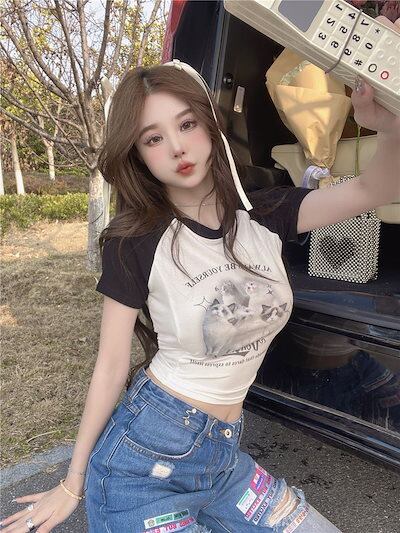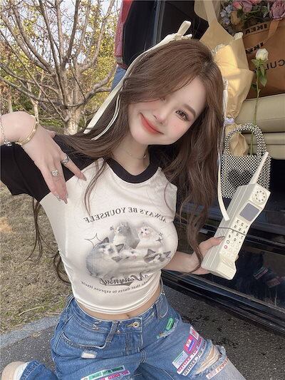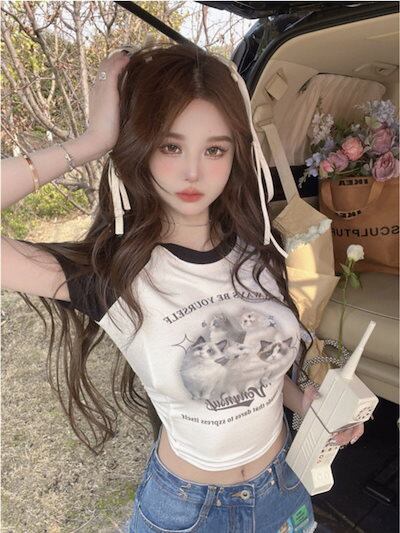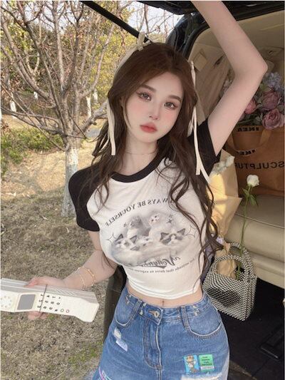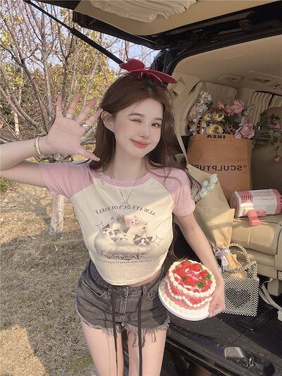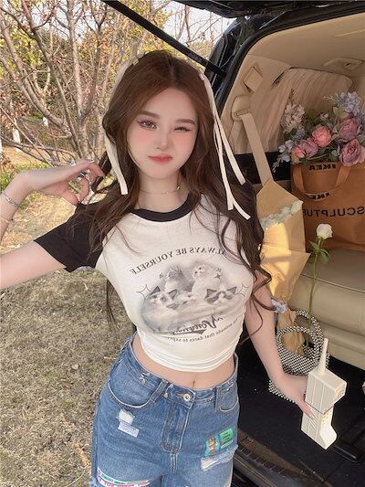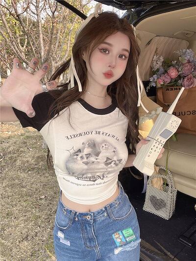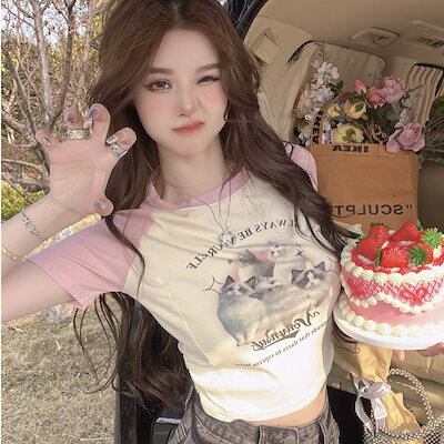 2024 夏 韓国トップス プリント半袖 Tシャツ 韓国 ラウンドネック スリム かわいいへそ出し ショート おしゃれスリーブ カジュアルセットアップコーデ丈 ファッションレディース フレンチお出かけ