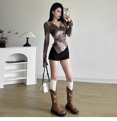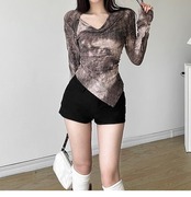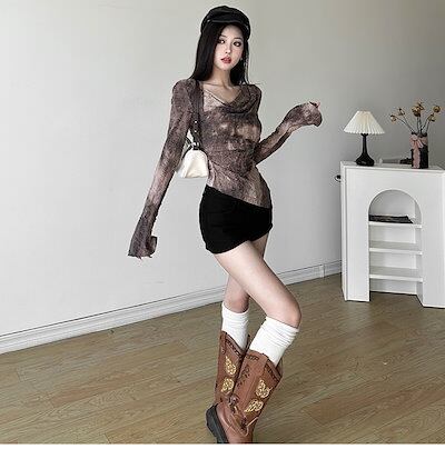 2024 春夏 女度を格上げ tシャツ ファッション トップス ショート 薄手 韓国系 シースルー レディース 長袖 薄手 フィット加工 プリント レイヤード 重ね着風 肌見せ 女っぽハイ タイト