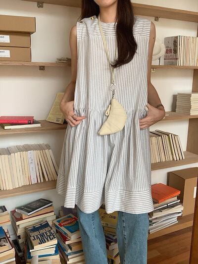 2024 夏 韓国ワンピース ミニ丈 Aライン ストライプ ラウンドネック ノースリーブ ハイウエスト 美脚効果 脚長効果 細見え 夏 おしゃれ かわいい キュート ガーリー 韓国ファッション レディ