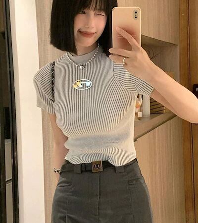 2024 春夏 甘い トップス Tシャツ クルーネック丈 休日 フレンチ 韓国 ブラウス ファッション タイト スリムフィット丈短め ショート レディース 休日 おしゃれ T