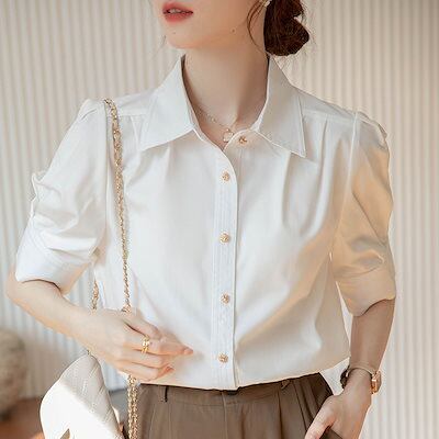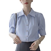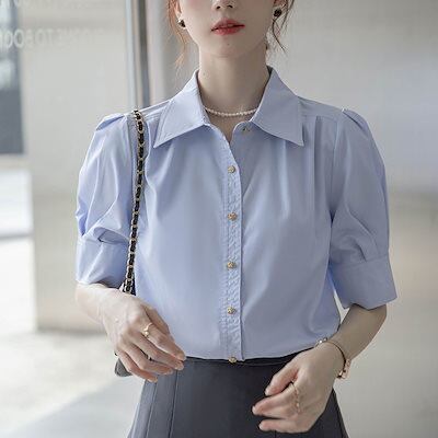 シアーシャツ レディース ブラウスバブルスリーブブルーシャツ女性インタビューフォーマルキャリア通勤半袖トップス