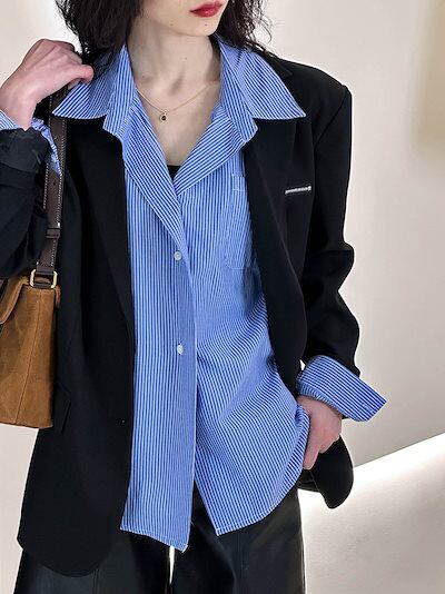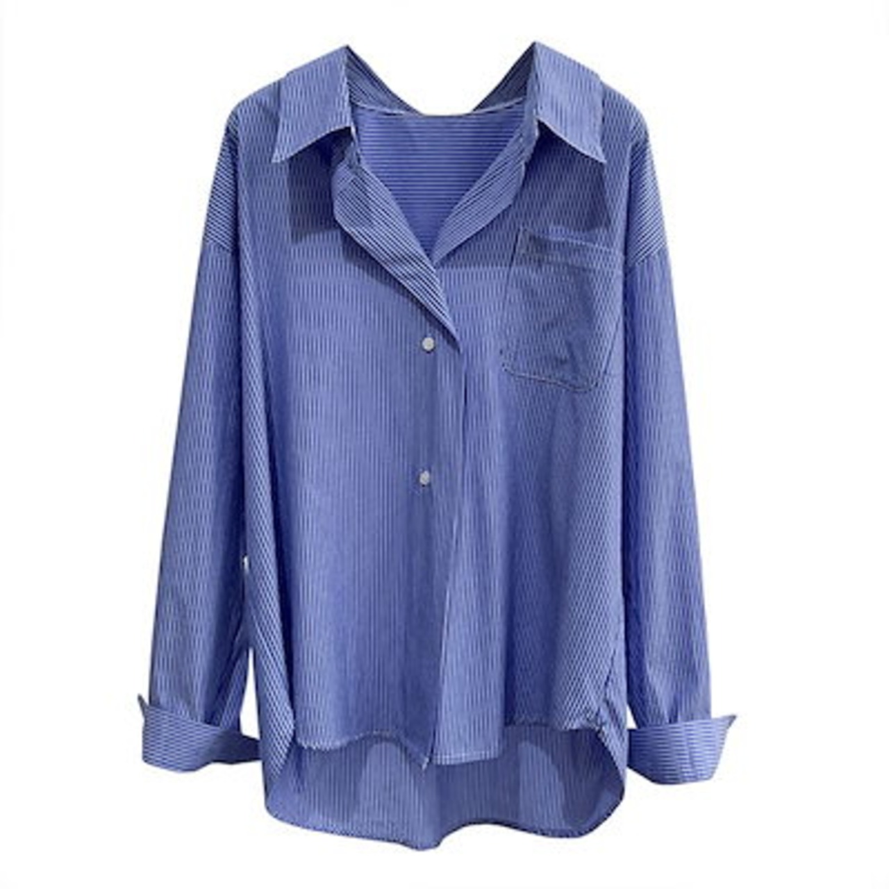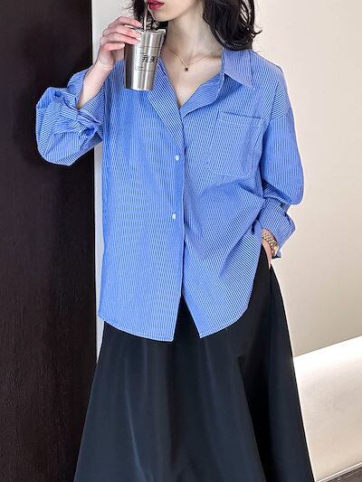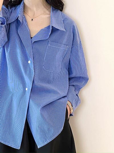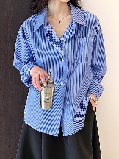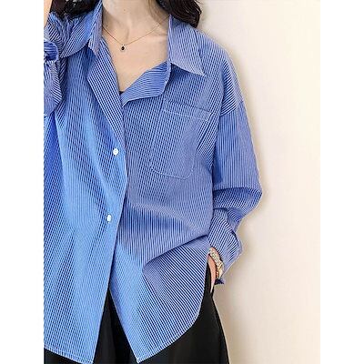 今っぽシアーシャツ レディースブラウス2024秋ブルーストライプシャツレディーススタイルルーズトップ