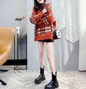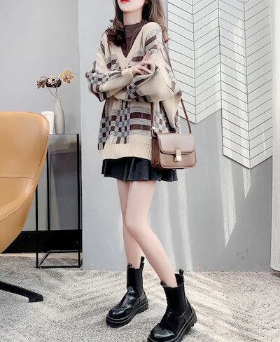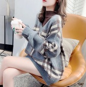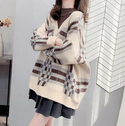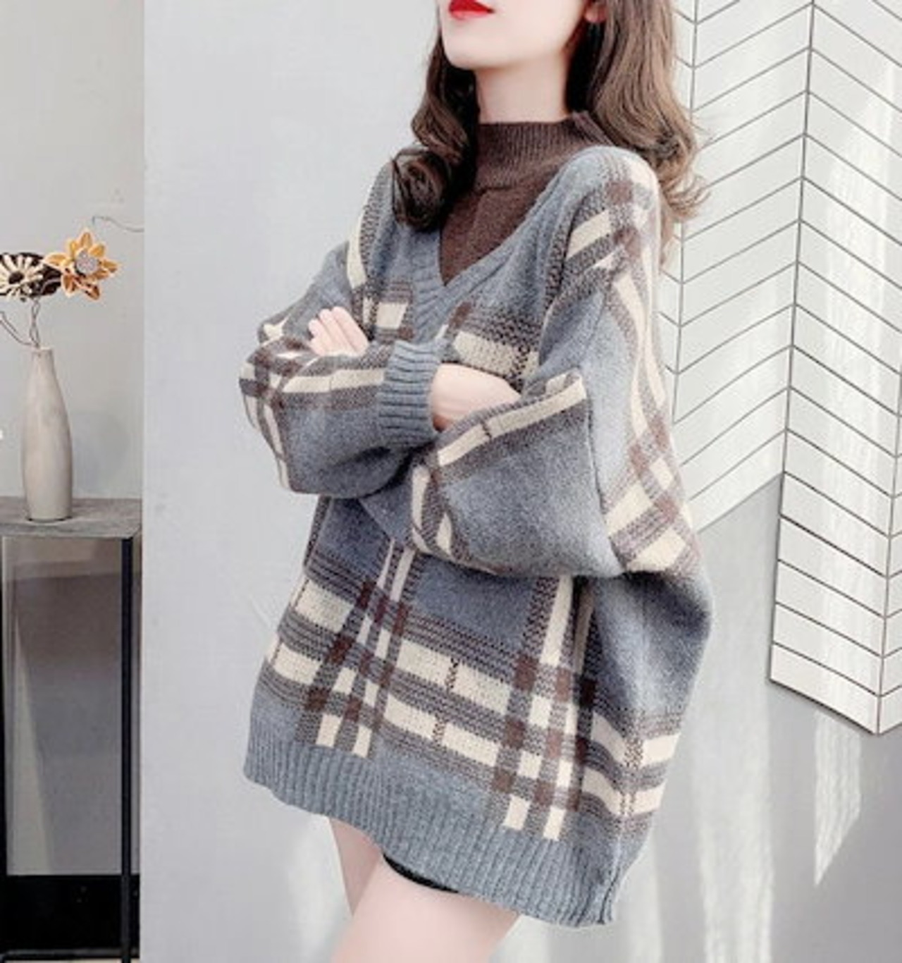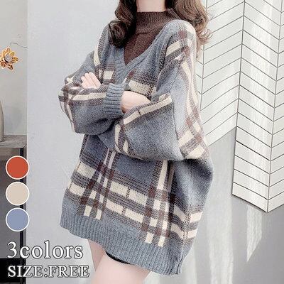ニット 重ね着風 ェック柄 オーバーサイズ 切り替え 秋冬 Vネック ニット トップス 大き目 カーディガン セーター レディース ハイネック ゆったり 長袖チ