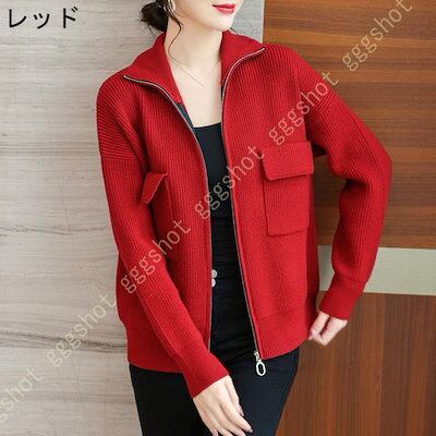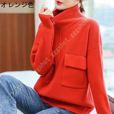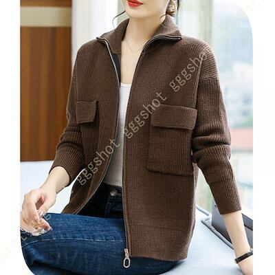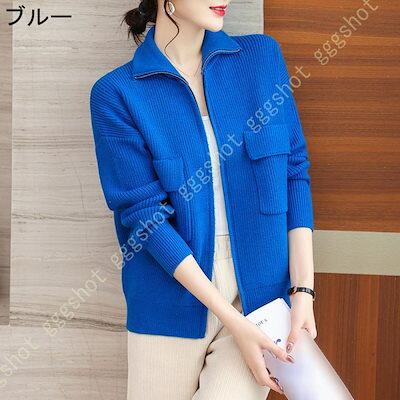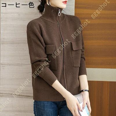 レディース カーディガン ニット セーター 厚手 無地 前開き ゆったり オーバーサイズ 体型カバー 可愛い 長袖 ファスナー付き ハイネック 着痩せ カジュアル