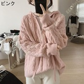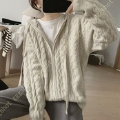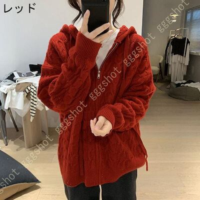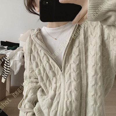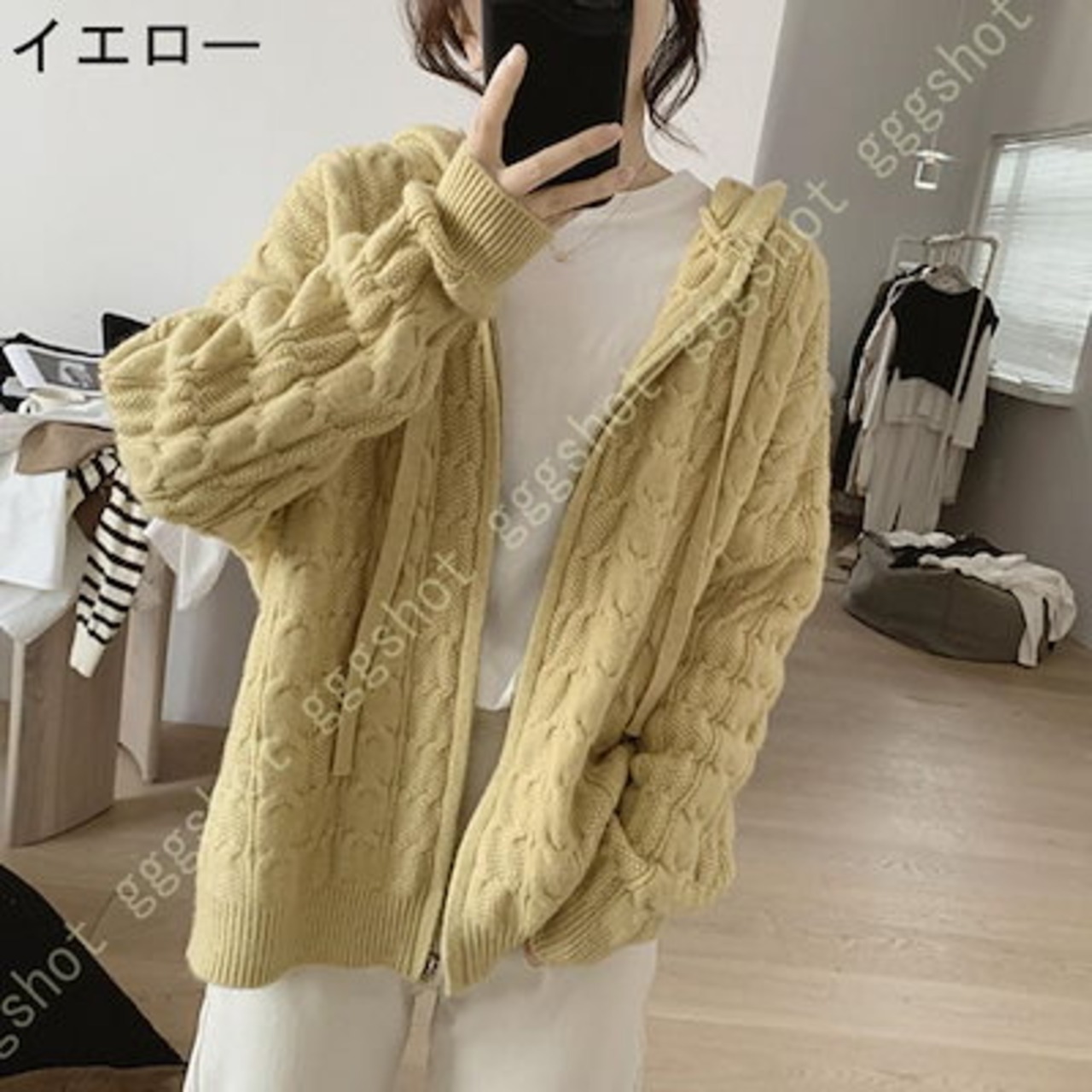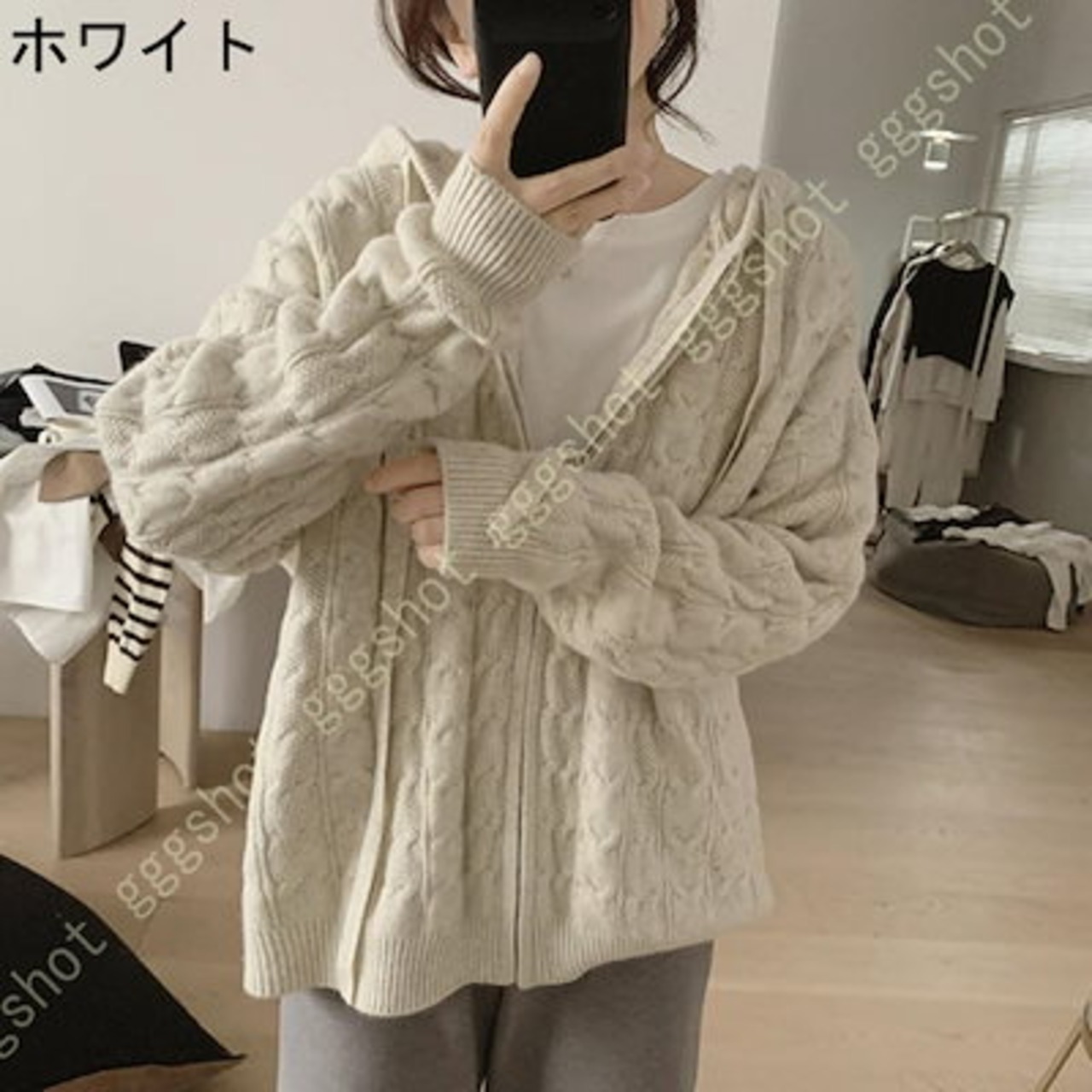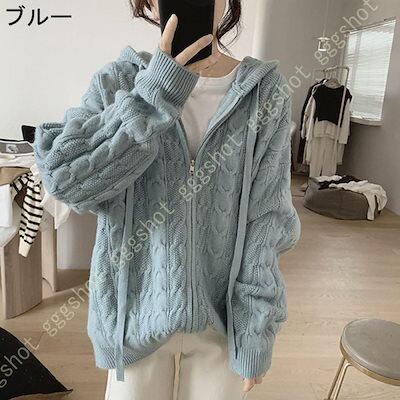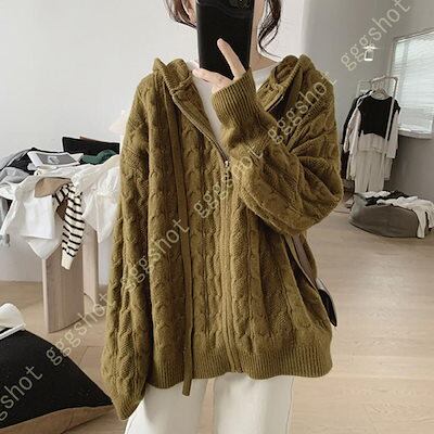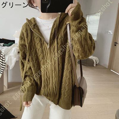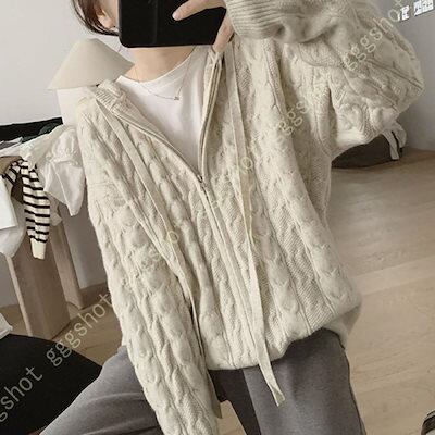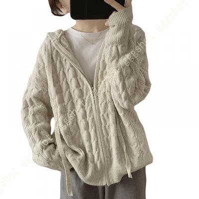 レディース カーディガン ニット セーター 厚手 無地 前開き ゆったり オーバーサイズ 体型カバー 可愛い 長袖 ファスナー付き フード付き 着痩せ カジュアル