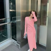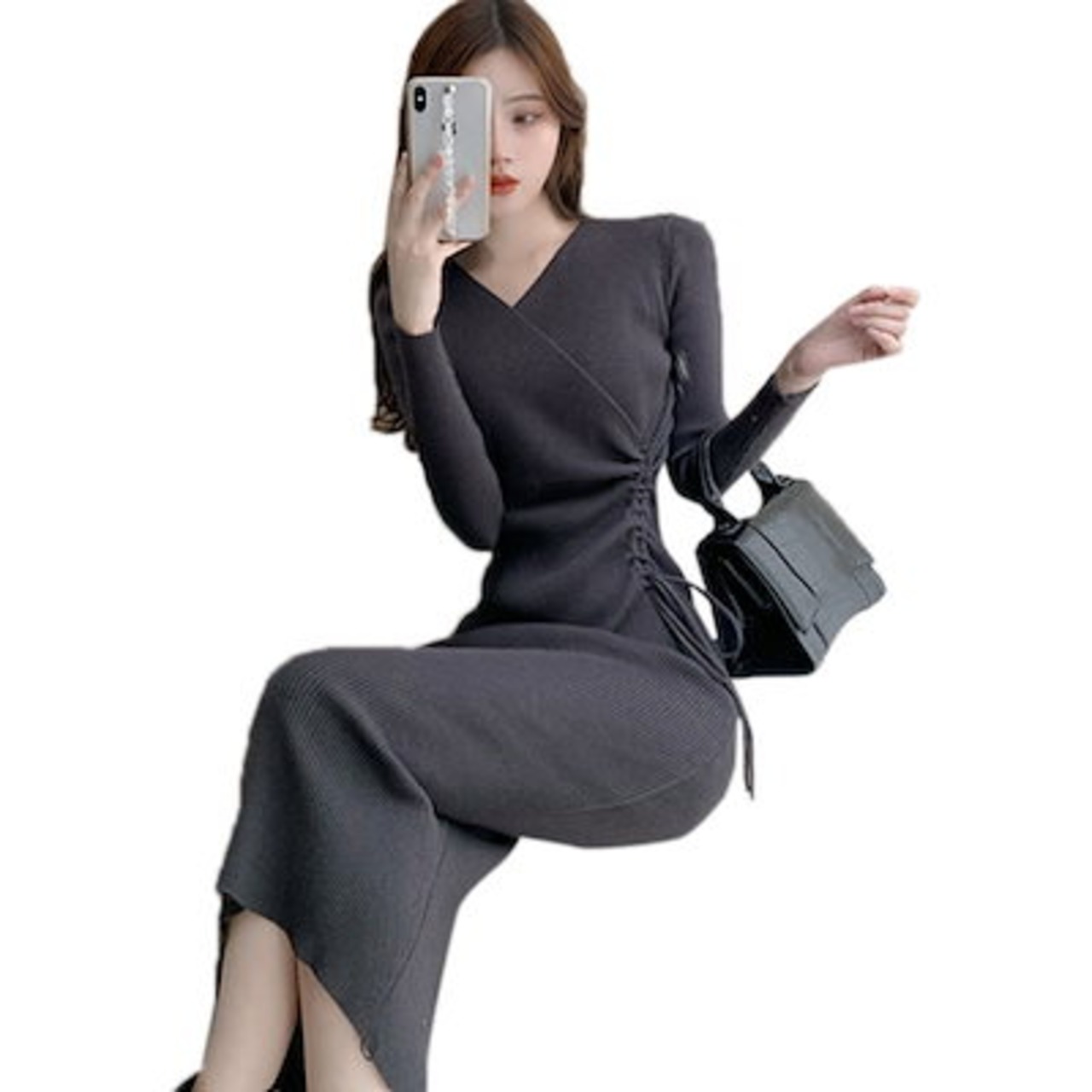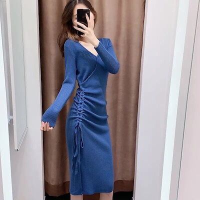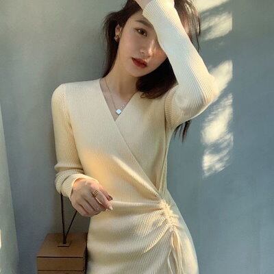 ニットワンピース レディース 秋冬 港風 気質 クロス Vネック ドローストリング スリミング ニット セーター